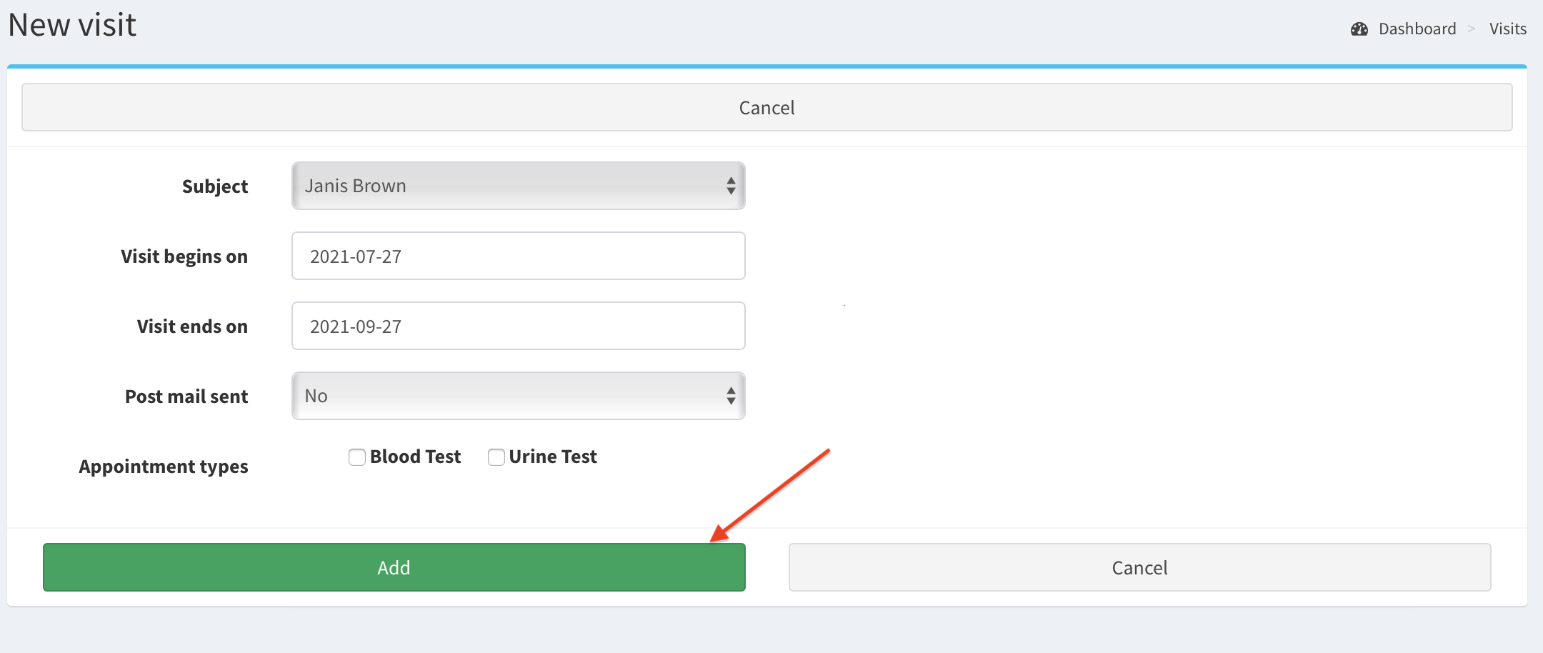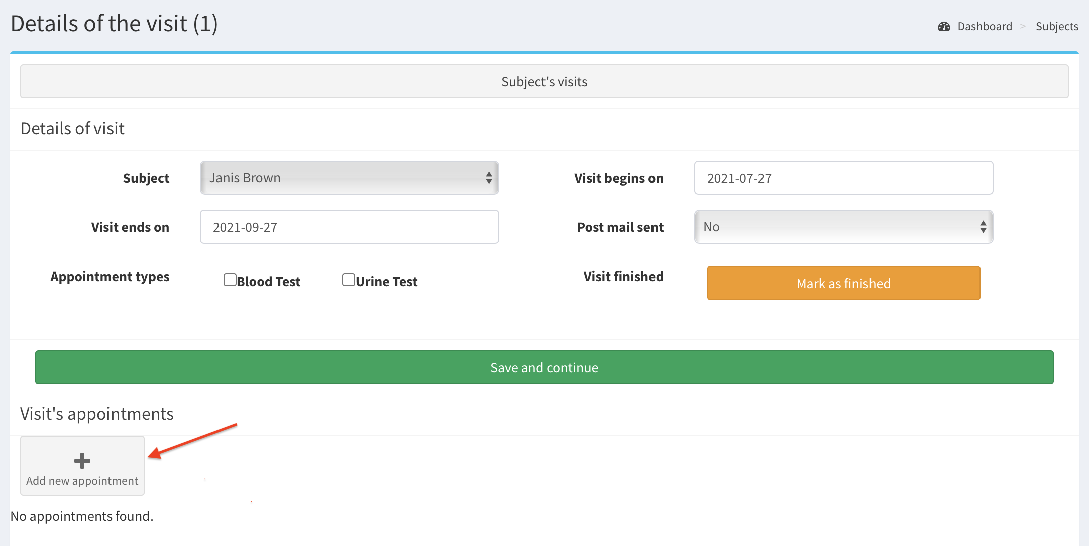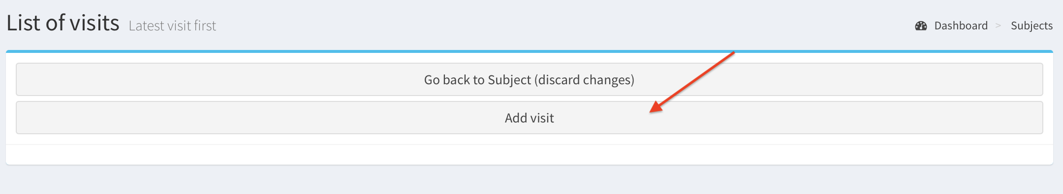 - This subject does not have any visits yet. Before we add an appointment we need to create a visit. Click Add visit button.