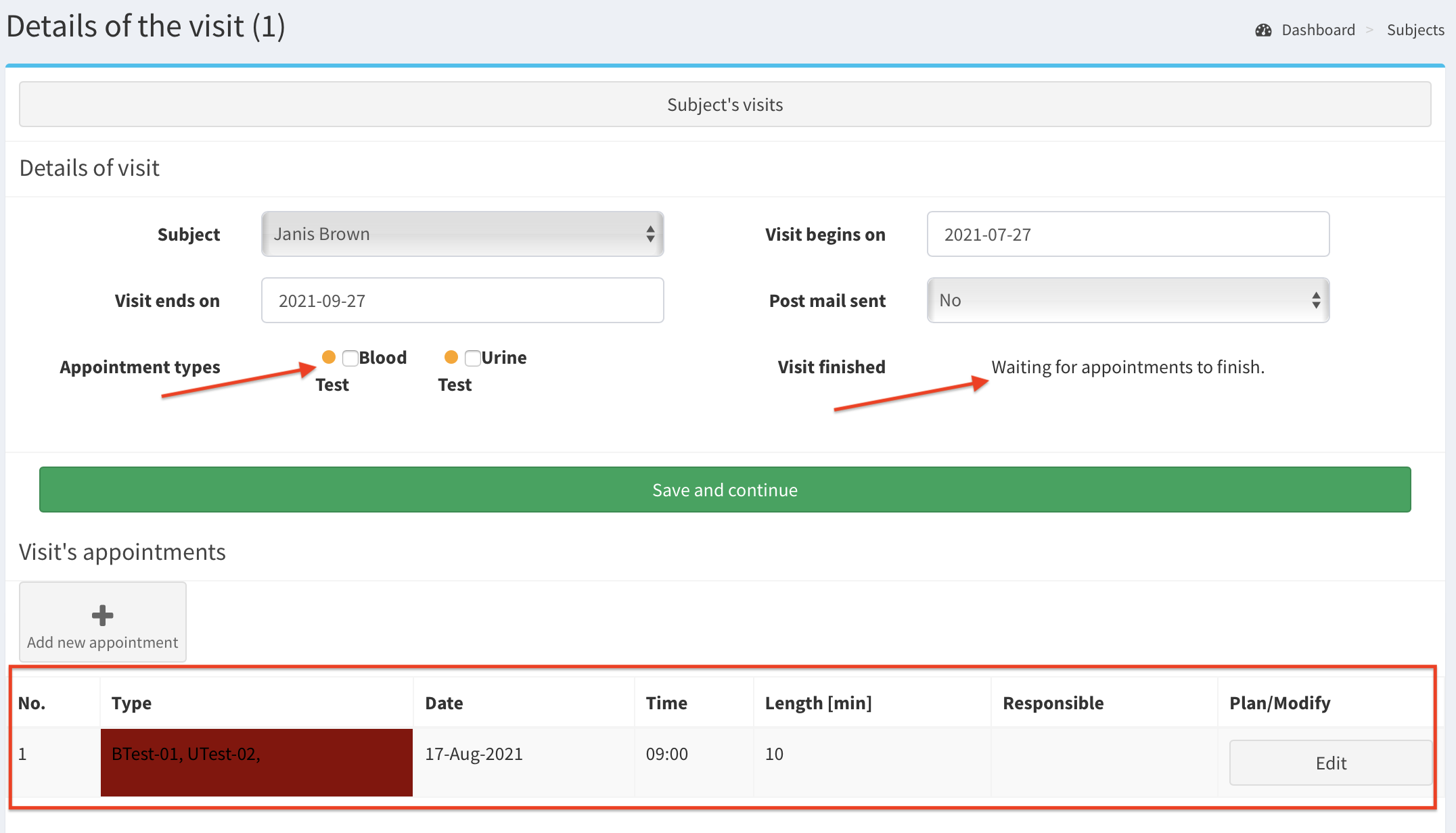 Now you see details of the appointment in Visit’s appointments. Also, status of the visit has changed to Waiting for appointments to finish. Next to the appointment types the orange dots are displayed marking that these assessments are scheduled. After assessments in appointment are finished the visit can be marked as finished too.