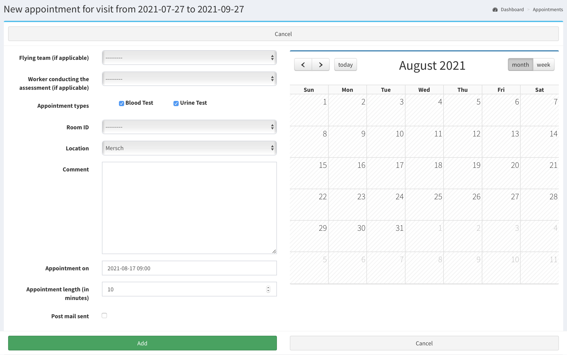 - At this stage, enter the various information of the appointment. Click on the calendar on the right side to choose a date of an appointment. In our example: the appointment will start at 9:00 17th August 2021. During it two assessments (appointment types) will be conducted (blood test and urine test).