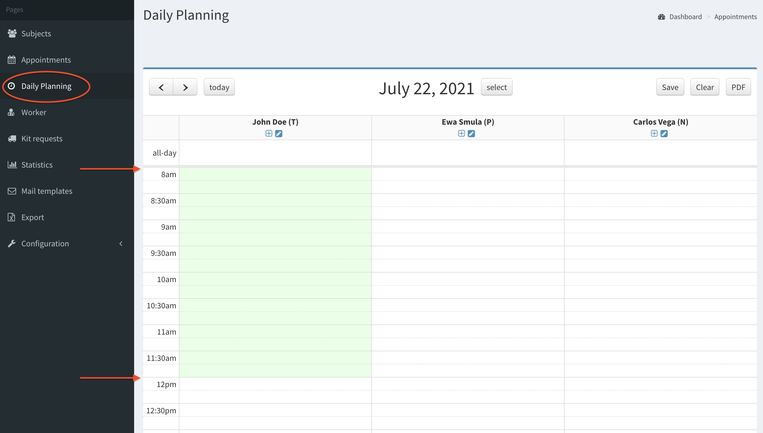 - Click on the Daily planning button on the left menu and check if the appointment availability created before is on the planning.