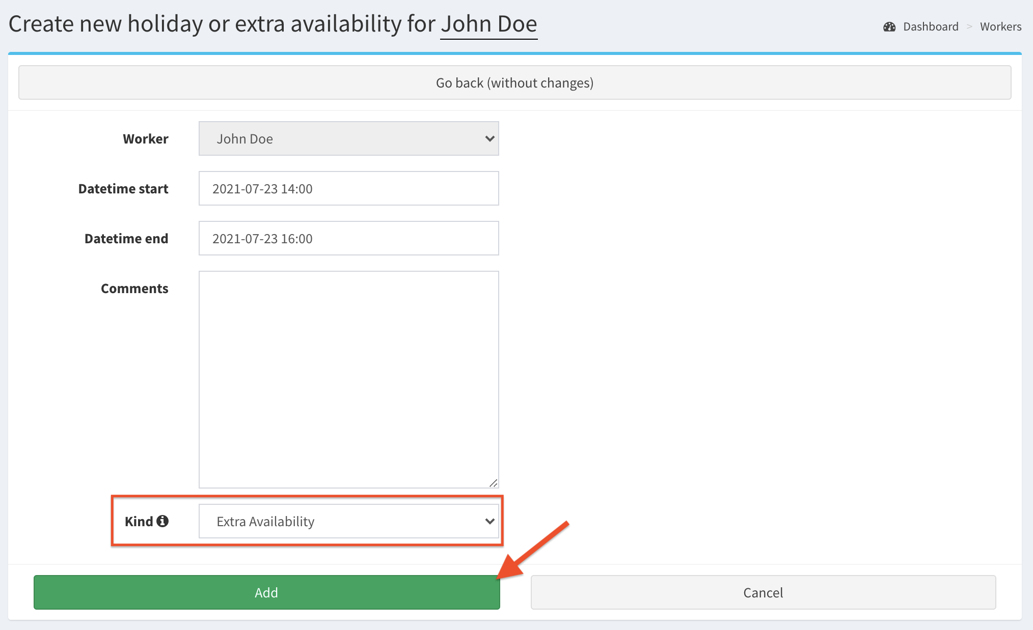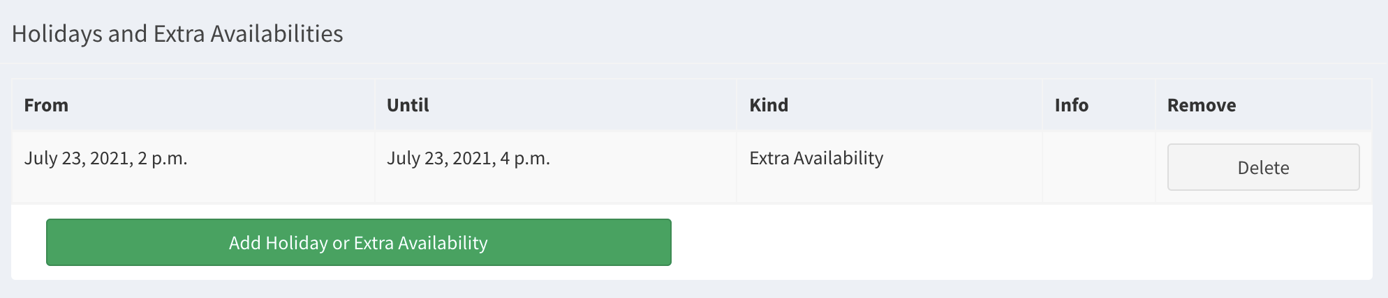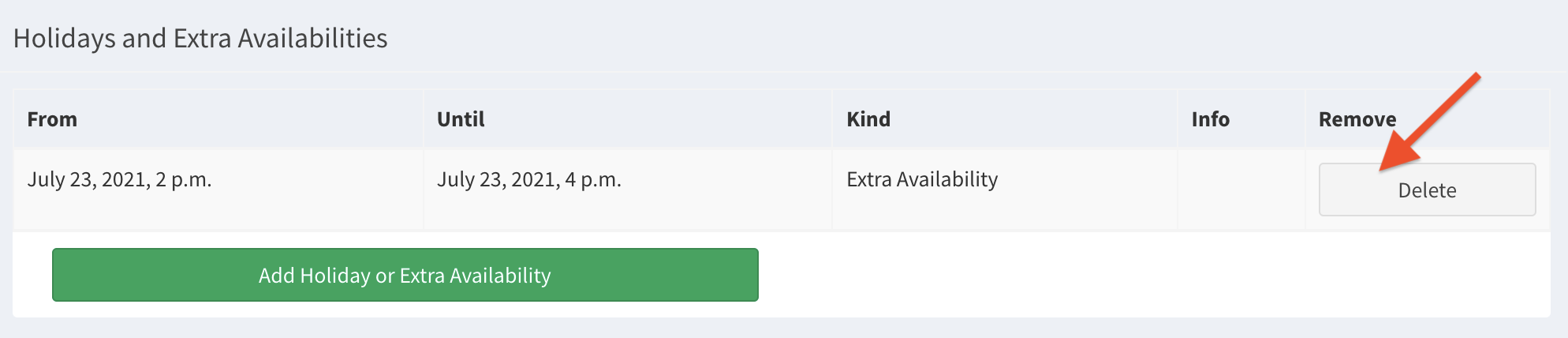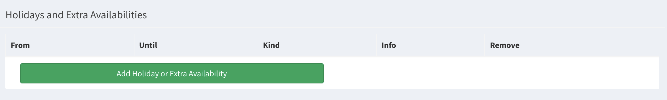 - Go to the bottom of the page and click on the button Add Holiday or Extra Availability.