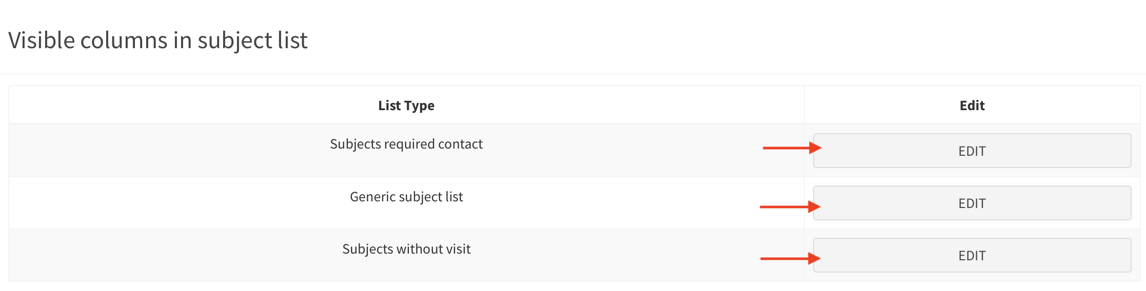 In this section you can set up which columns (i.e. First name, Type) are visible by default in the Subjects lists.