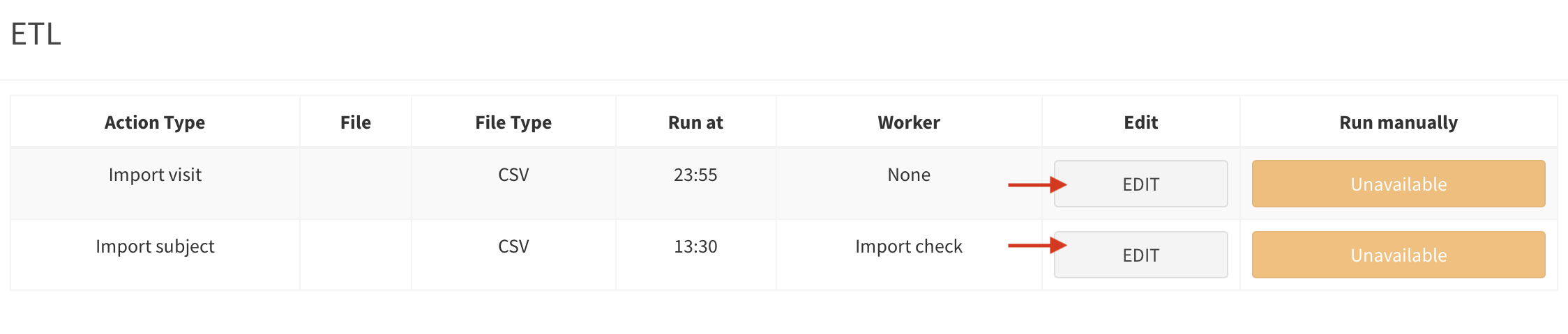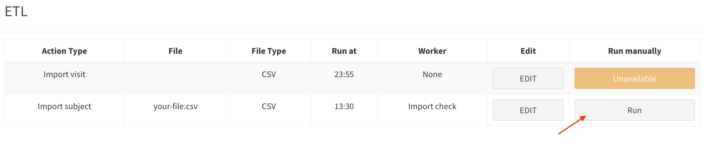 your-file.csvinetldirectory. To identify the subject, the import file must contain the reference tosubject numberorscreening number. Without at least one of these columns in the csv file, import will fail.