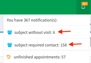 - Subjects without visit (sublist of Generic subject list; the list is available in notifications, see image below)