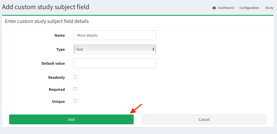 Here you can add a customized field to the subject study details.