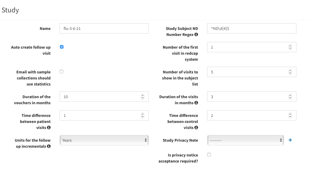 Study Subject ND Number Regex: defines the regex to check the ID used for each study subject. Keep in mind that this regex should be valid for all previous study subjects in the database.