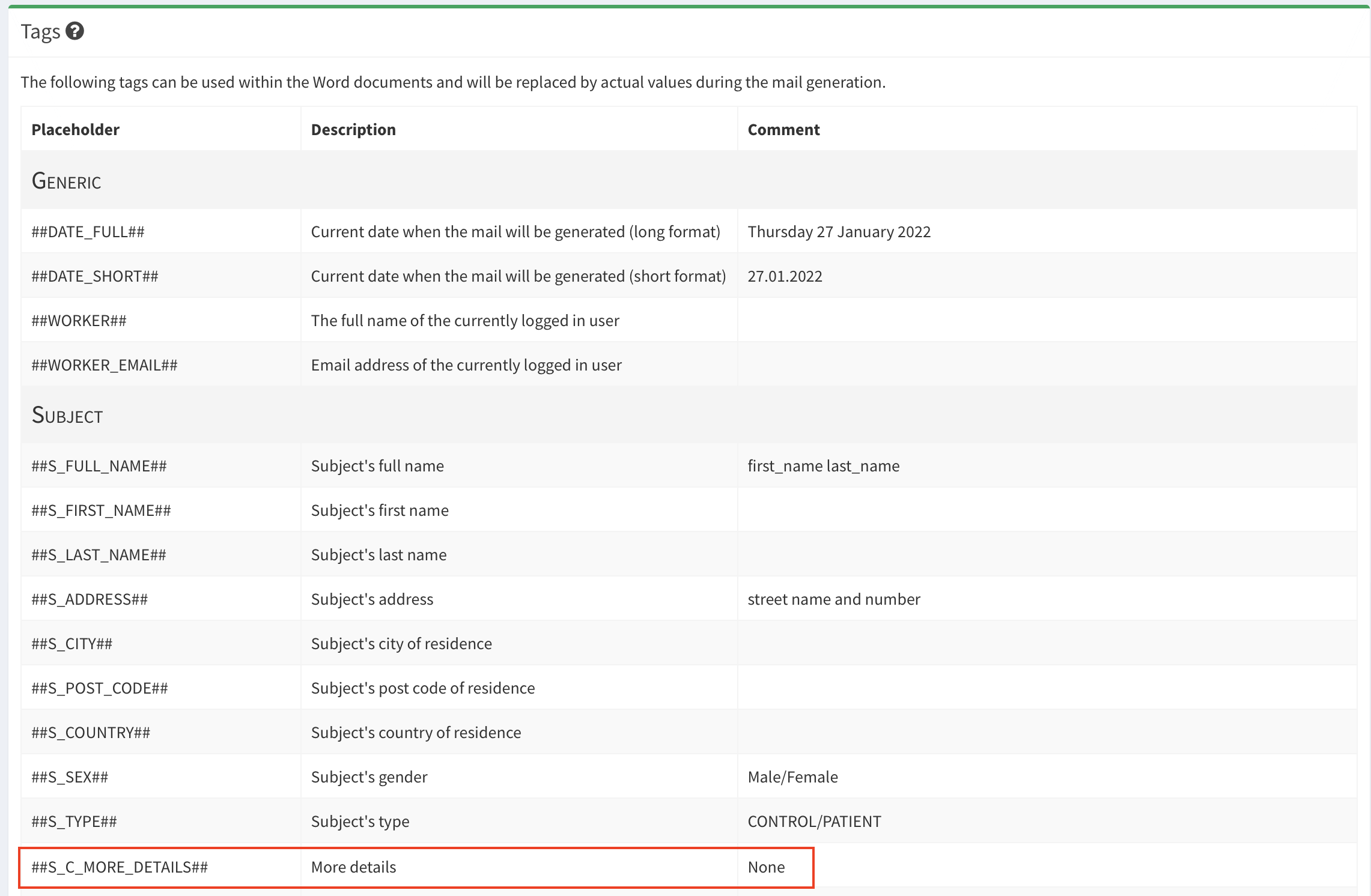 - Subjects required contact (sublist of Generic subject list; the list is available in notifications, see image below)