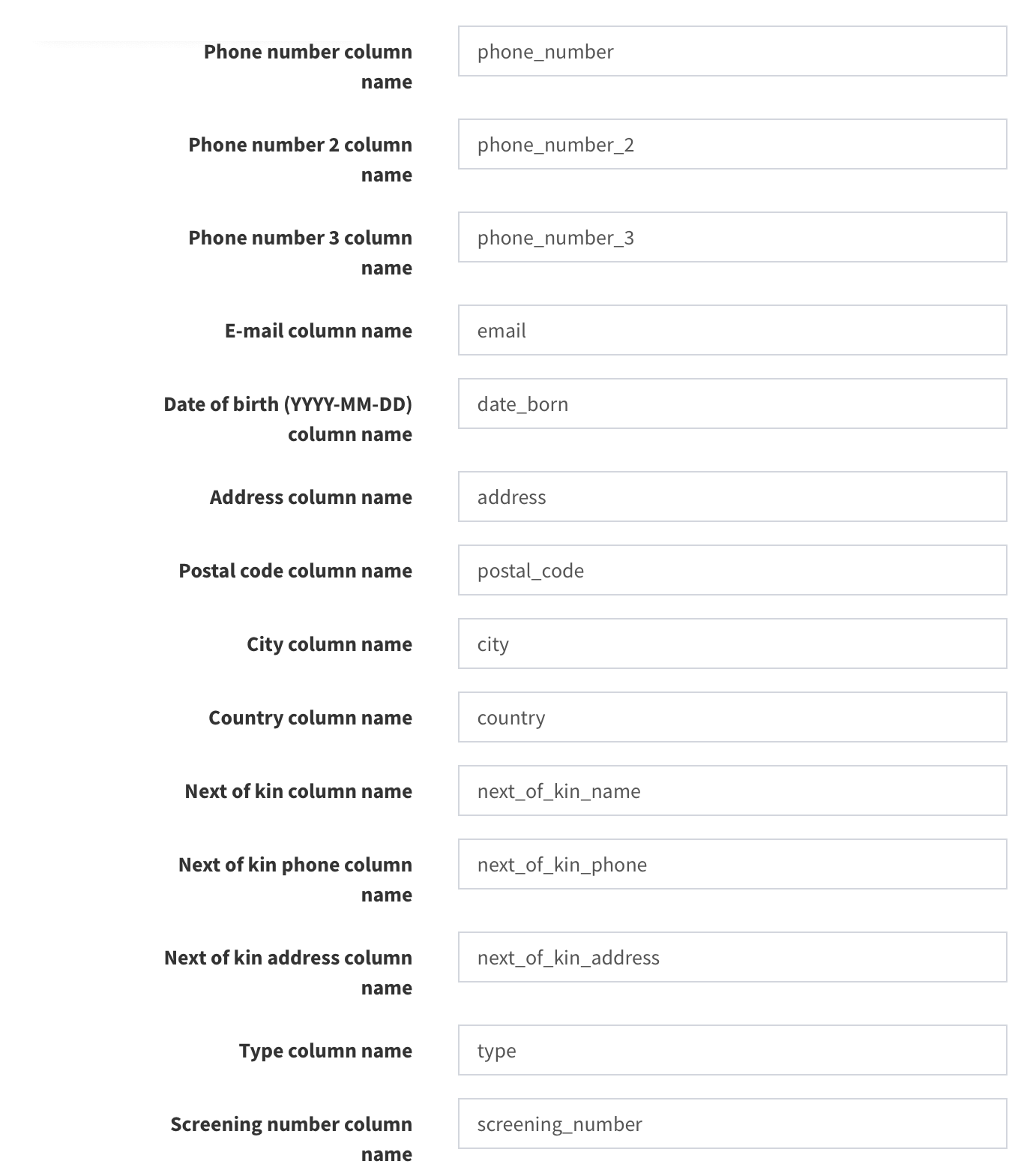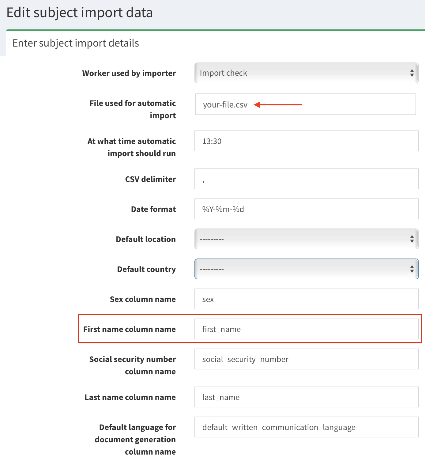 your-file.csv. First Name column nameof subject is linked tofirst_name. It means in your csv file there is column with the headerfirst_name.