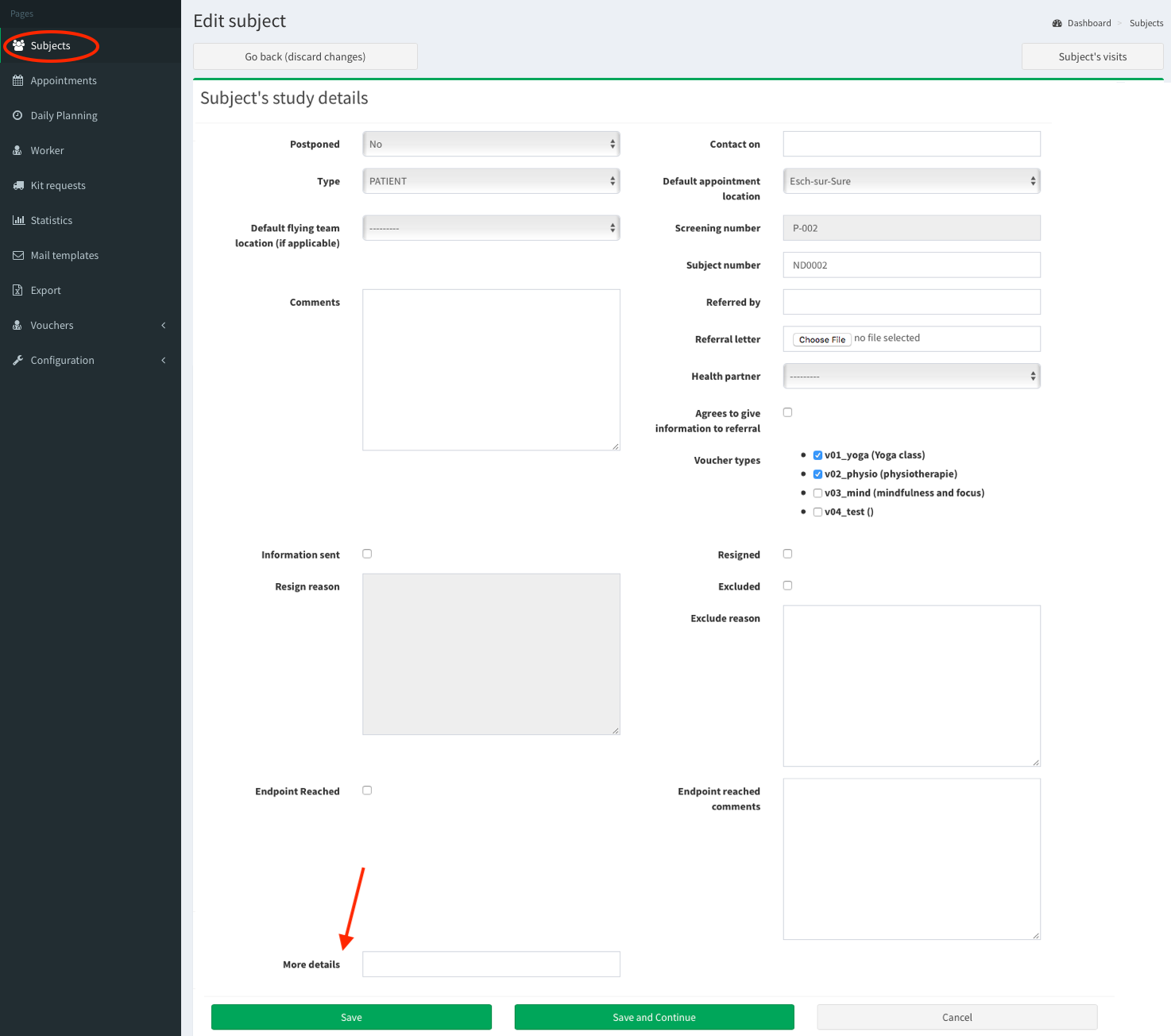 In this section you find the details of the study which corresponds with Subject’s study details in Add/edit subject page. Here you can customize which subject’s details will be displayed in Subject’s study details section.