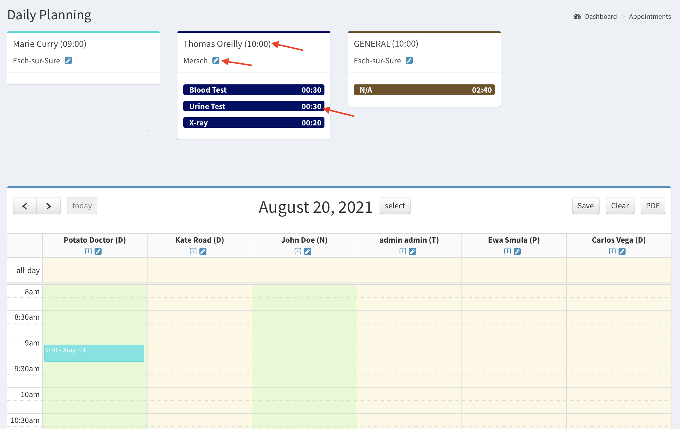 To schedule the appointment drag and drop the color bar from to the Daily Planning table (see videos below). You can drop the color bar after the time the appointment is scheduled, what is highlighted with light blue color. Click Save button to save the schedule.