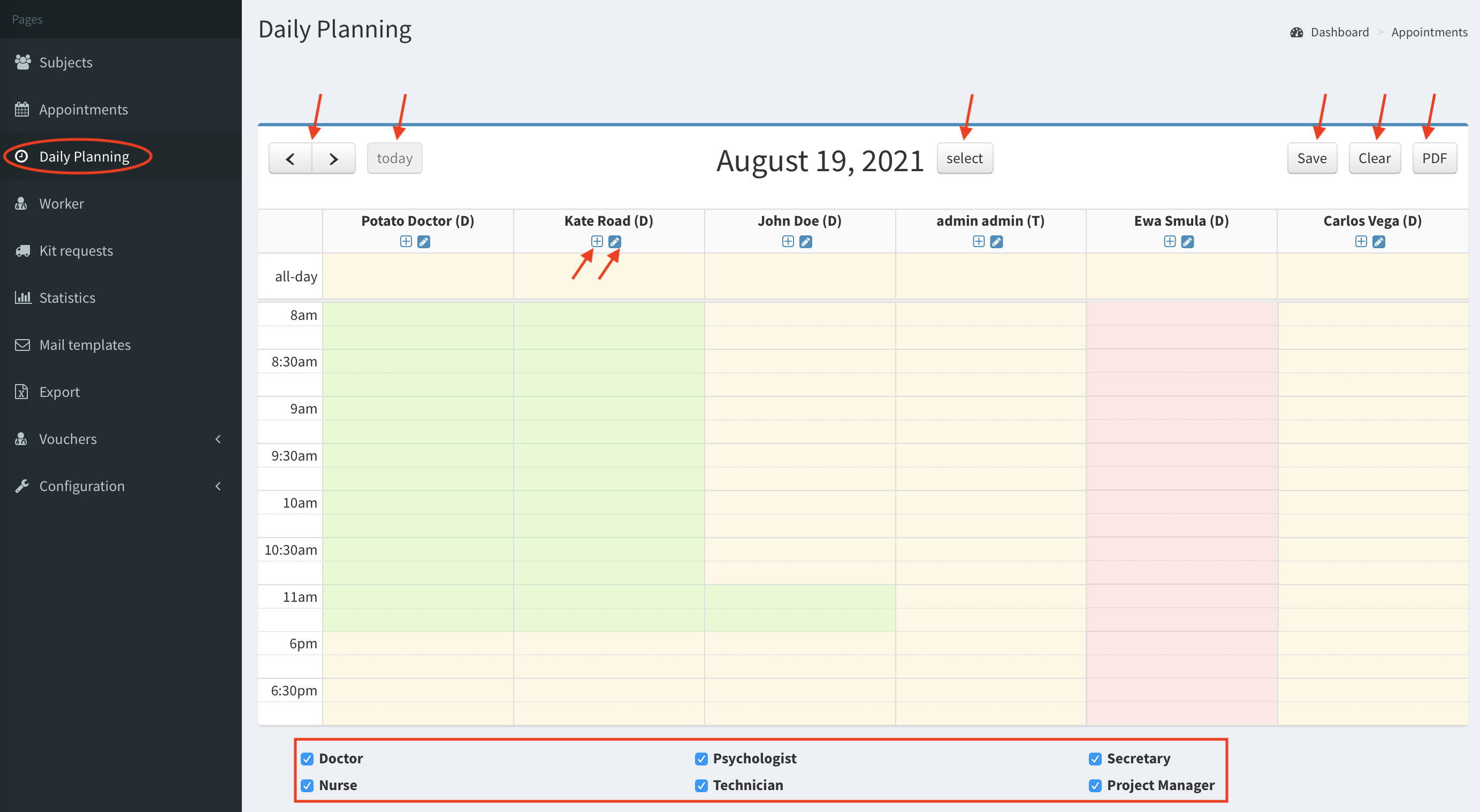 In Daily Planning table header, next to the worker’s name, there is an abbreviation of worker’s role, given in the brackets (e.g. Kate Road (D) - for Doctor). The checkboxes below the table allow to customize which workers roles are displayed. Example: If you would like to display just the doctors, check Doctor checkbox only.