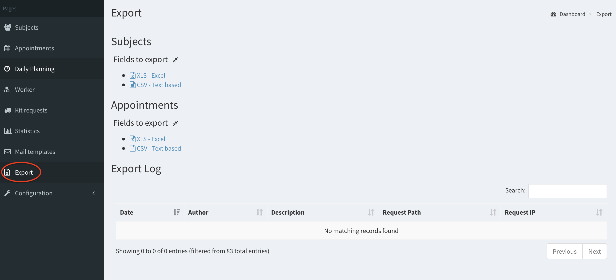 The subjects and appointments contain numerous details (e.g. subject’s name, time of appointment etc.). In SMASCH it is possible to export any of this data to Excel or CSV file. Go to the Export page in the left panel (image below).