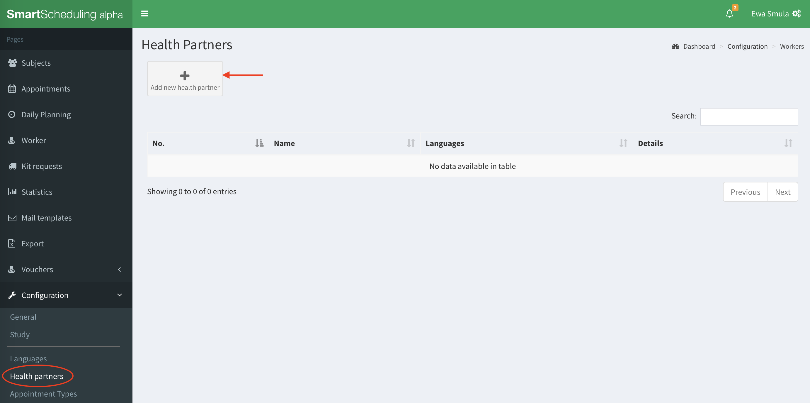Note: To see Health partners in your SMASCH instance this feature has to be enabled in the study configuration.