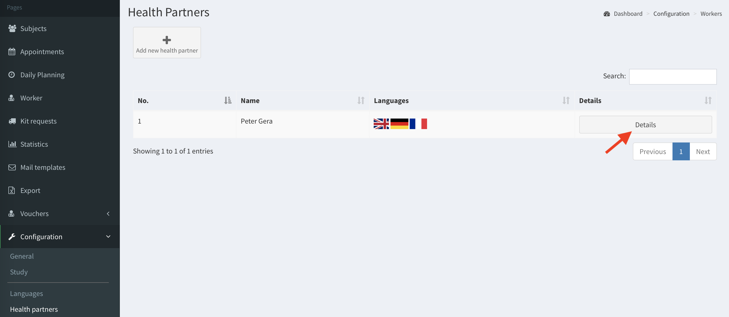 - The Health partner has been added. The details of Heath partner can be edited at any moment with Details button. Note: The health partner cannot be removed in SMASCH instance. Only SMASCH Administrator has the access to delete any SMASCH worker/health partner.