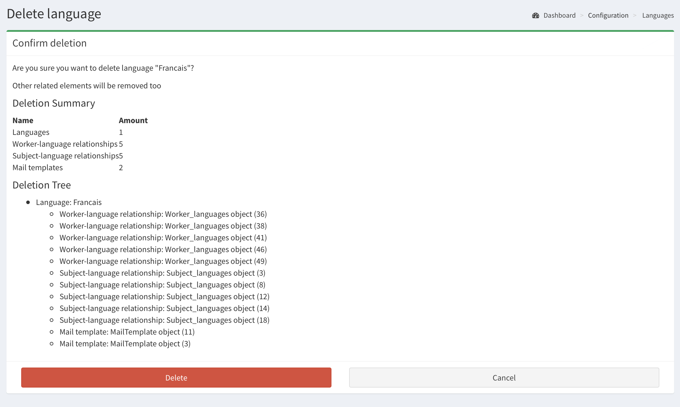 By clicking the delete button (see the first image on the page) you can remove the language. Removing language will remove all subjects with this language specified as Default language for document generation. There will be warning displayed (image below) providing information about all other objects that will be removed along.