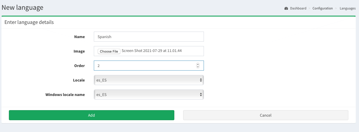 - Complete the fields and choose an image for the language that you create. Then click Add.