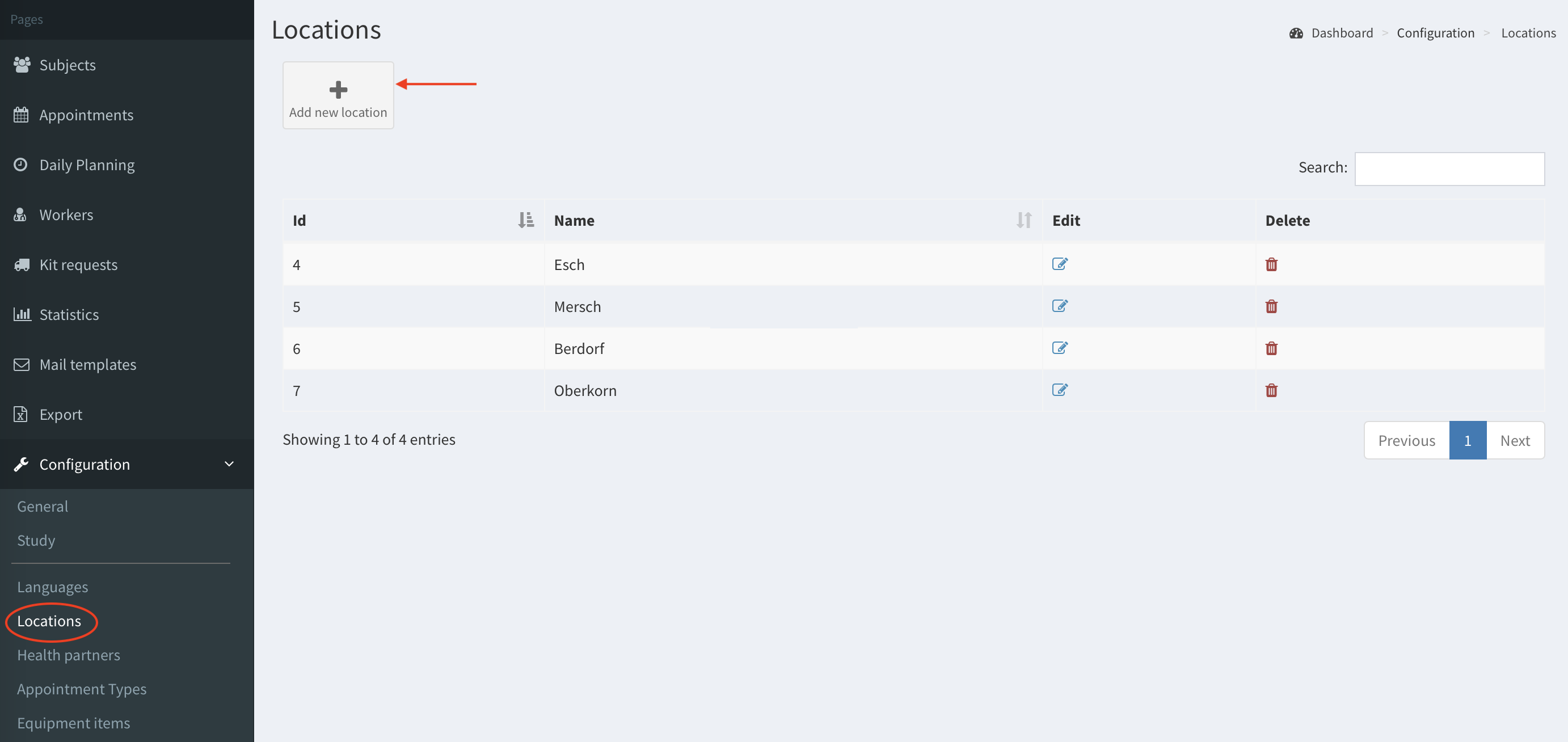 Note: If you delete a location: the appointments with this location would not be visible in appointments calendar view (as appointments in calendar view are filtered by available locations assigned to the logged user). But you can see these appointments in subject’s visits.