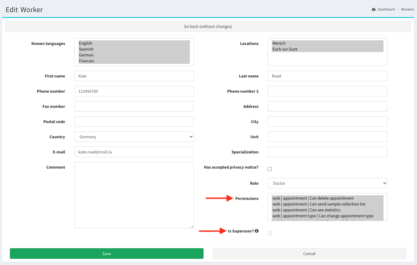 Image below shows the Edit worker page. The permissions are listed and can be multiple selected. The checkbox Is Superuser? can be enabled by SMASCH Developers and indicates a superuser.