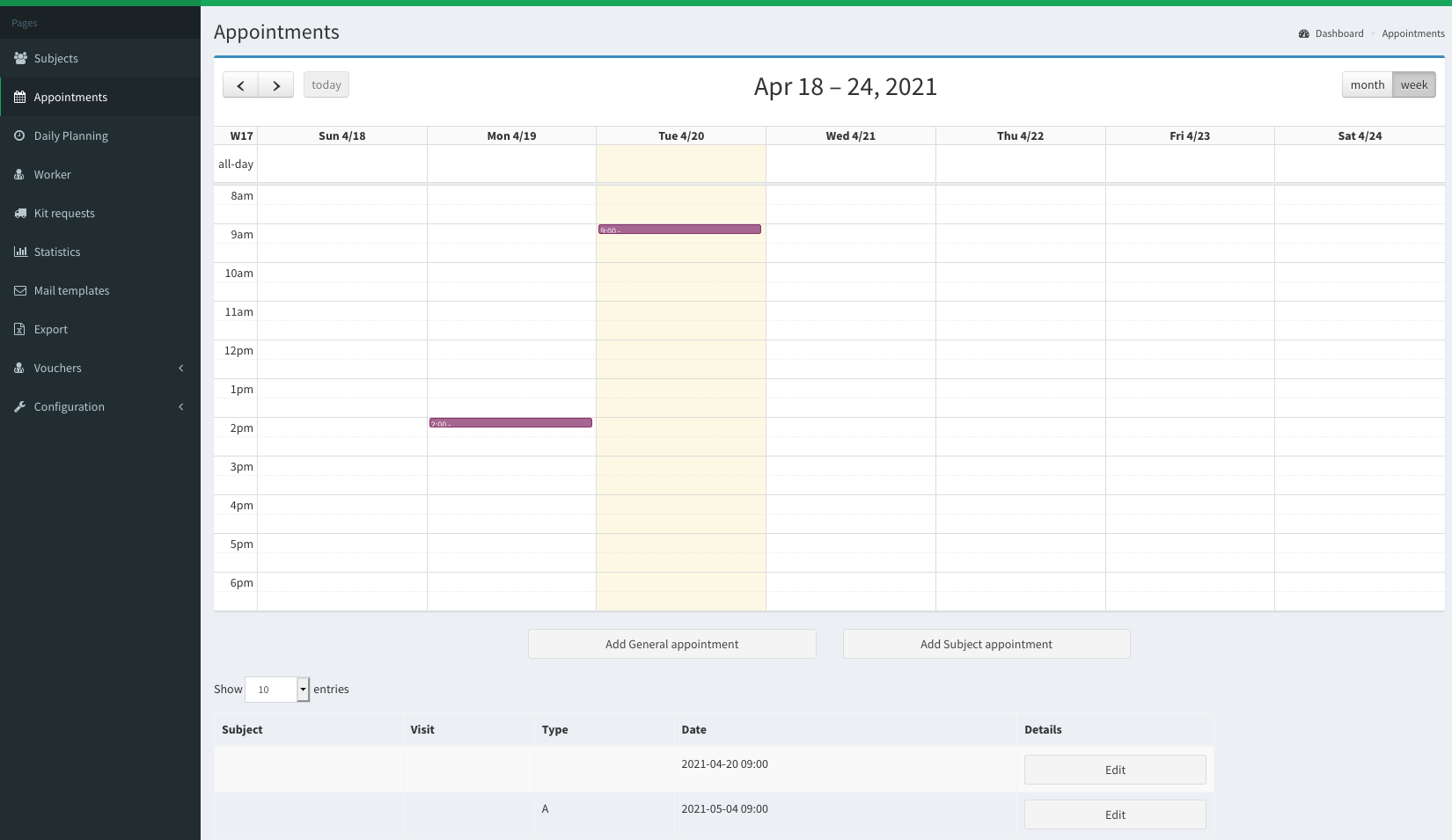 In SMASCH the basic entities are the subjects and the appointments. An appointment is one time event, displayed in the calendar view, with particular length (e.g. 10min, 60min), type (e.g. examination, test) and location. The appointment can be: