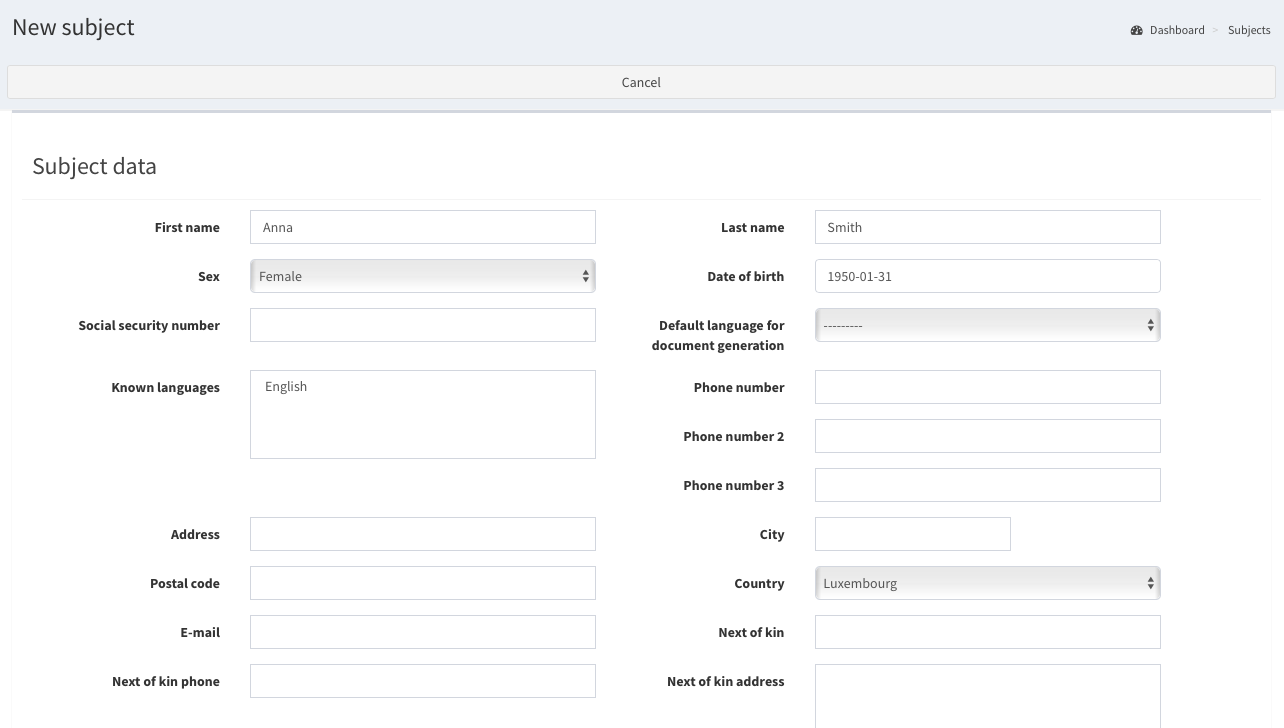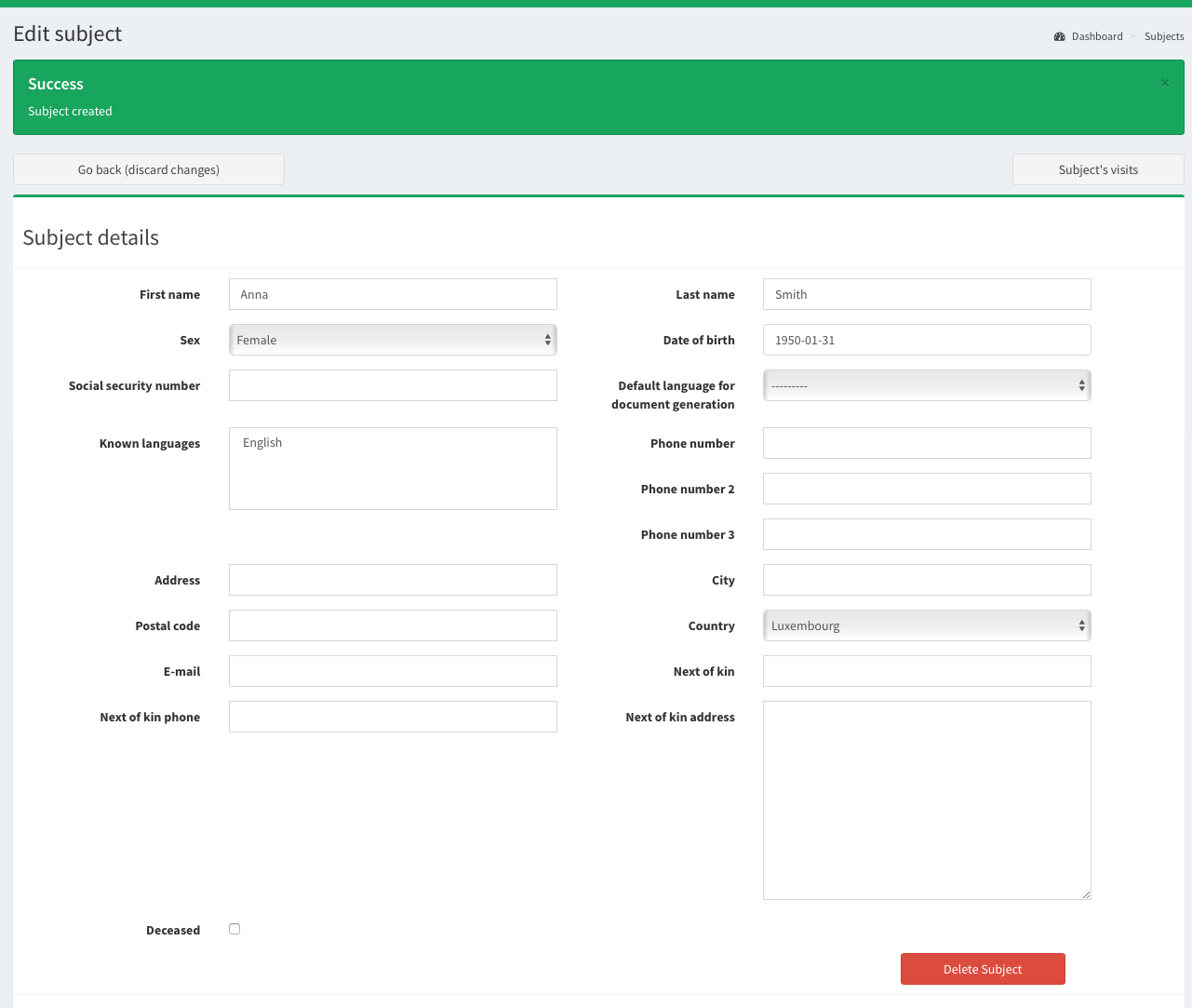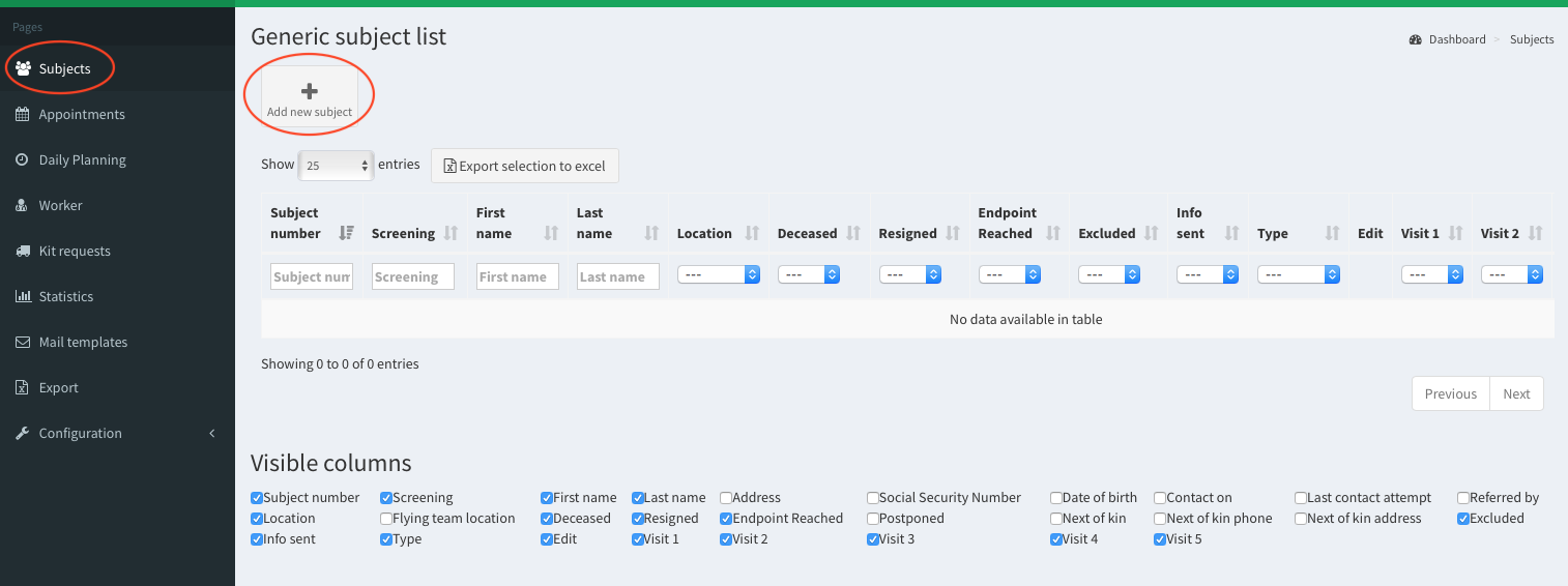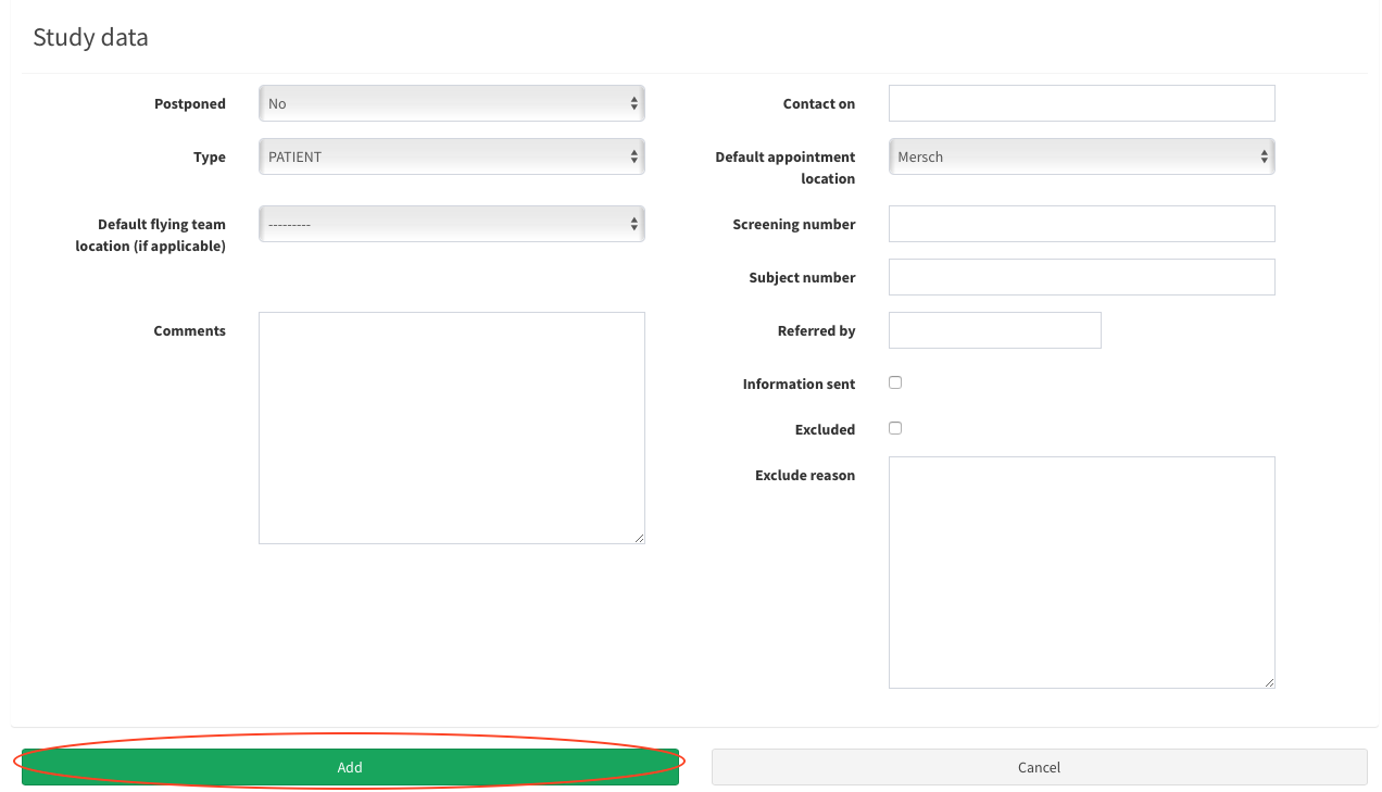 Add a new subjectFill the Subject data and Study data forms, then click Add.