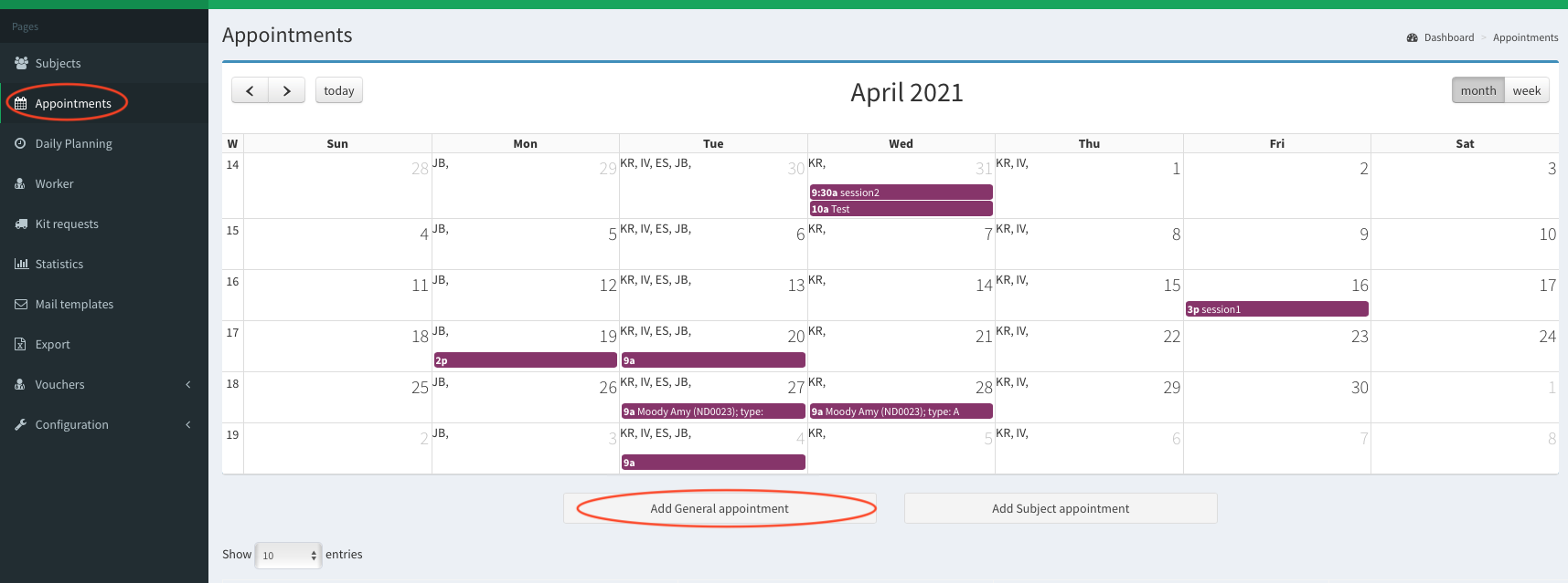 After successful login to SMASCH, you can see the main dashboard with the calendar view of the appointments. The calendar is displayed with the monthly view as default, and can be changed to weekly view with the buttons month/week in the top right corner of the screen. The calendar presents the appointments marked with colourful bars. The letters displayed in the particular days are the initials of workers, and indicate the worker’s availability for that day. The current day is highlighted with light yellow colour. Below the calendar, there are two buttons - Add General appointment and Add Subject appointment . Also, at the very bottom of the page, the upcoming appointments are listed.