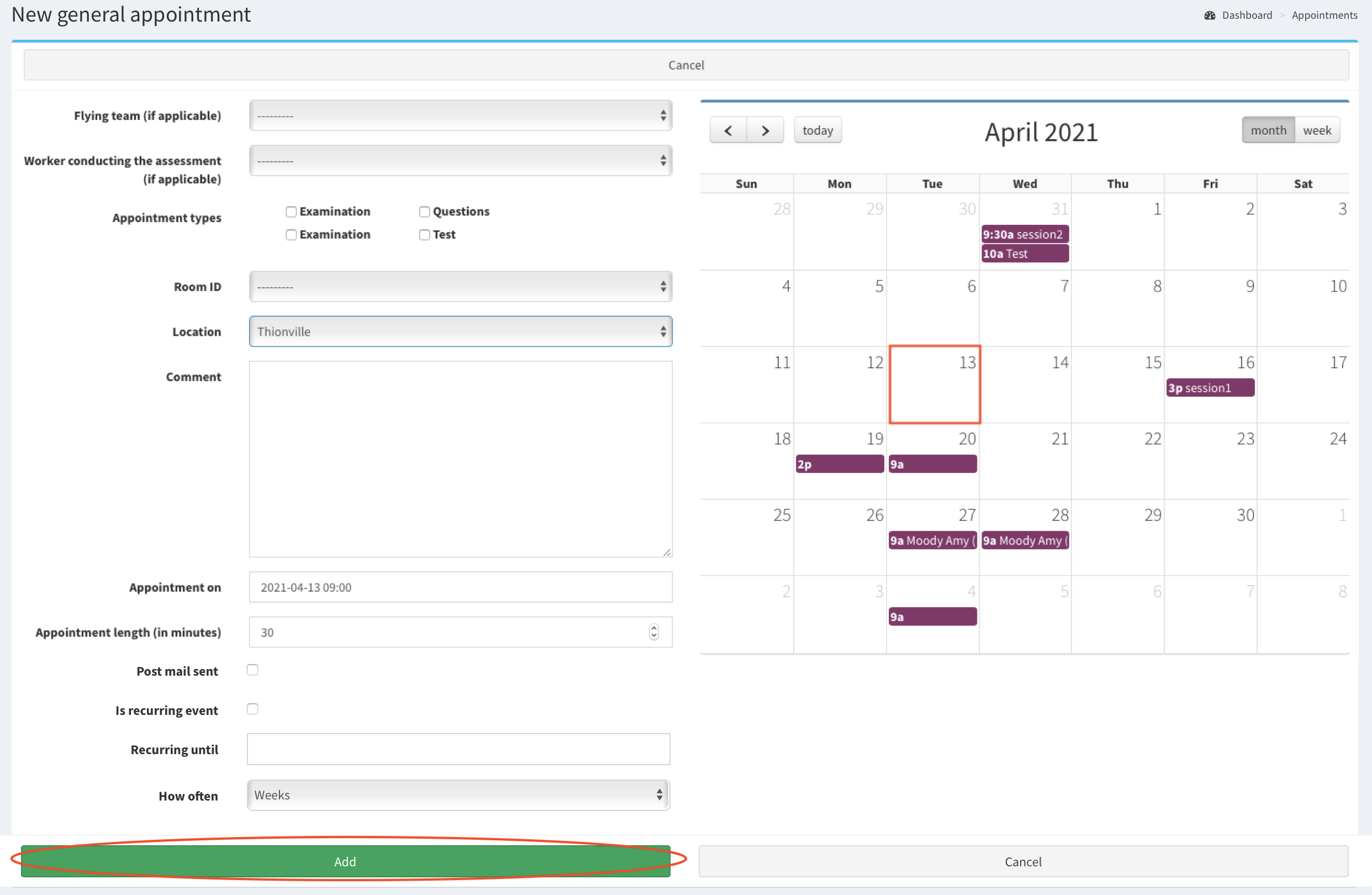 Fill the new general appointment formThe appointment on 2021-04-13 09:00 located in Thionville has been added now to the calendar. You can see colourful bar displayed on 13th April 2021 and with appointment’s time 9a (09:00). If you hover over the appointment, the popup with details (Location and Status) will be displayed.