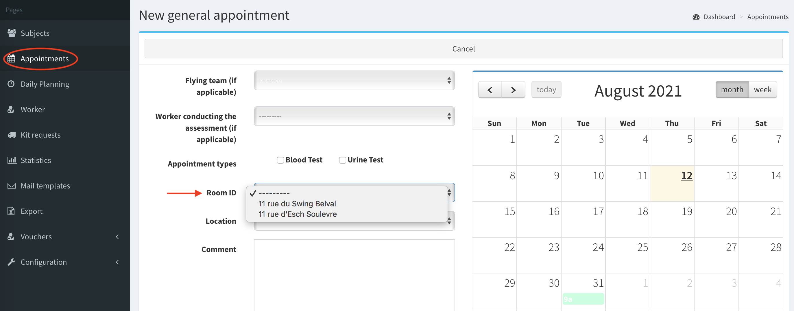 - The room can be chosen during adding an appointment.