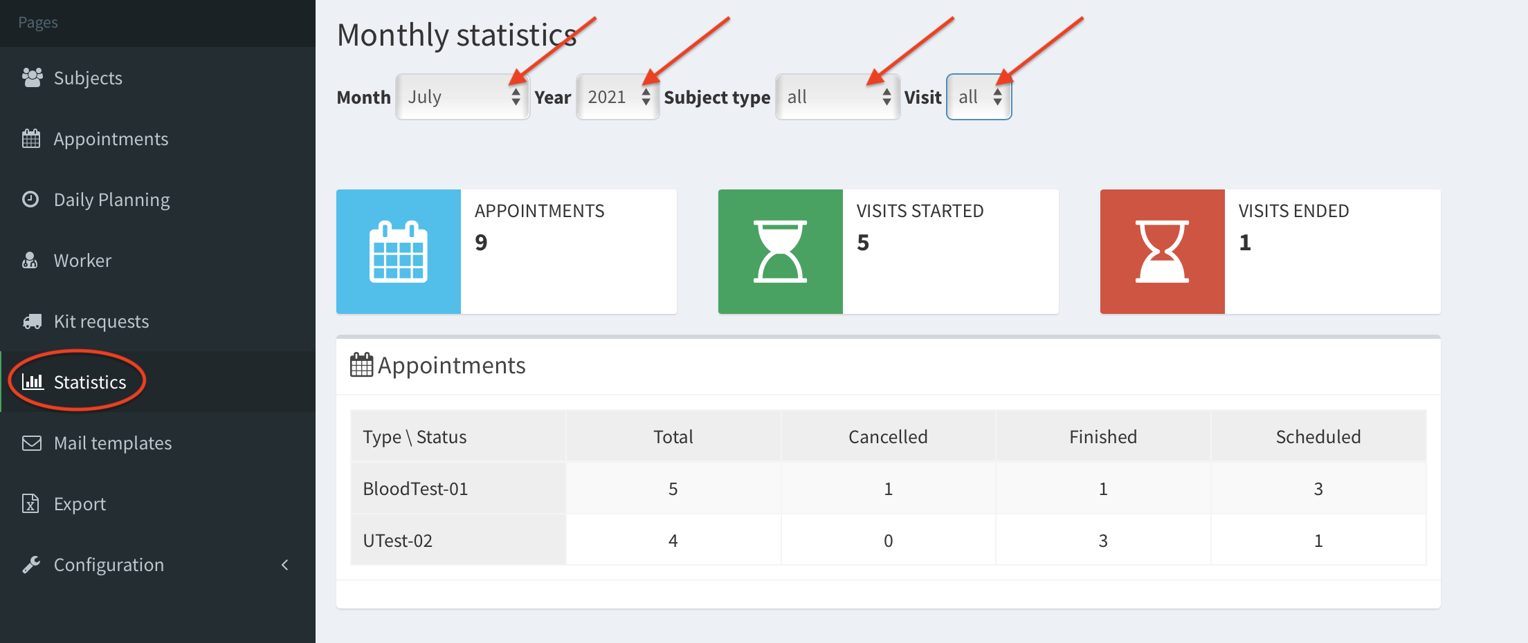 In the left panel, go to Statistics page. Here you find the monthly summary of the visits and the appointments. Moreover, you can check how many and which appointment types were conducted - in the table Appointments (image below).