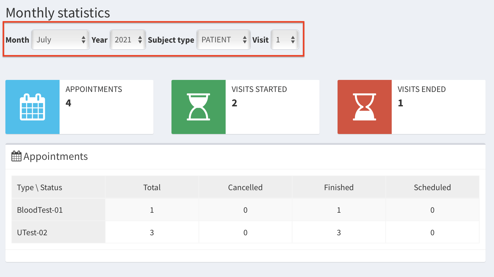 The example of monthly statistics for PATIENT (Subject type) having Visit 1 (Visit) during July 2021 are shown below: