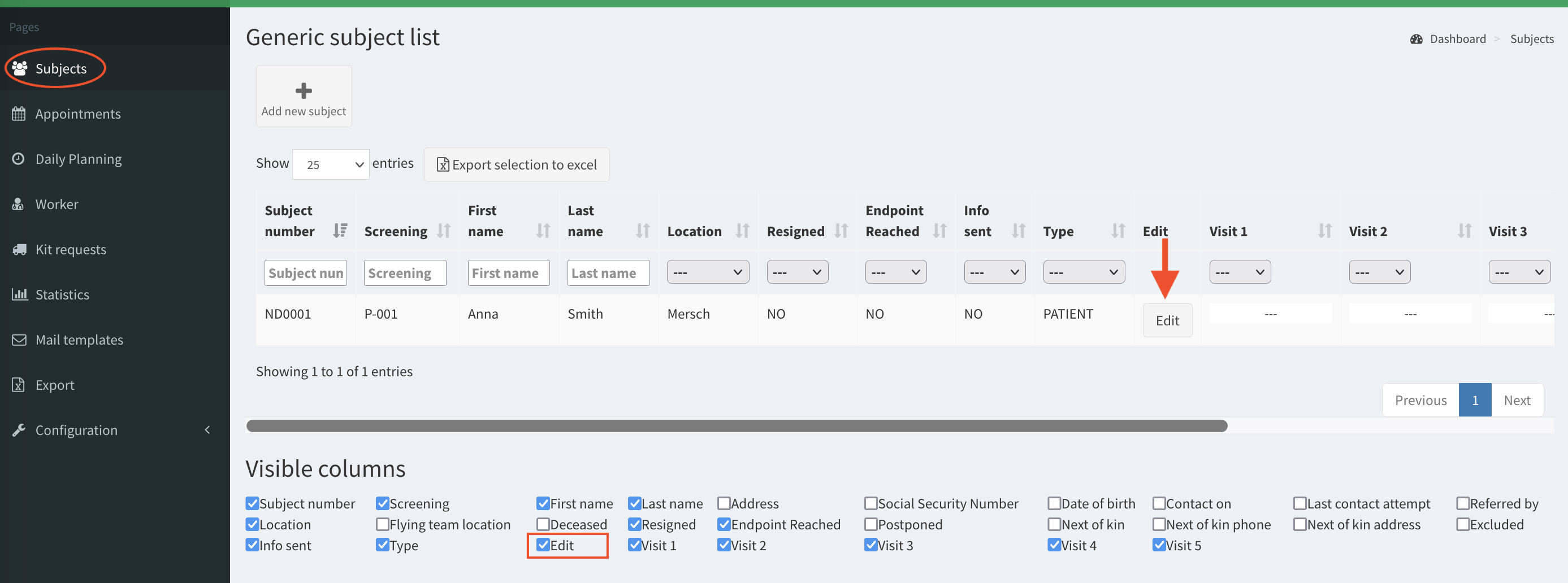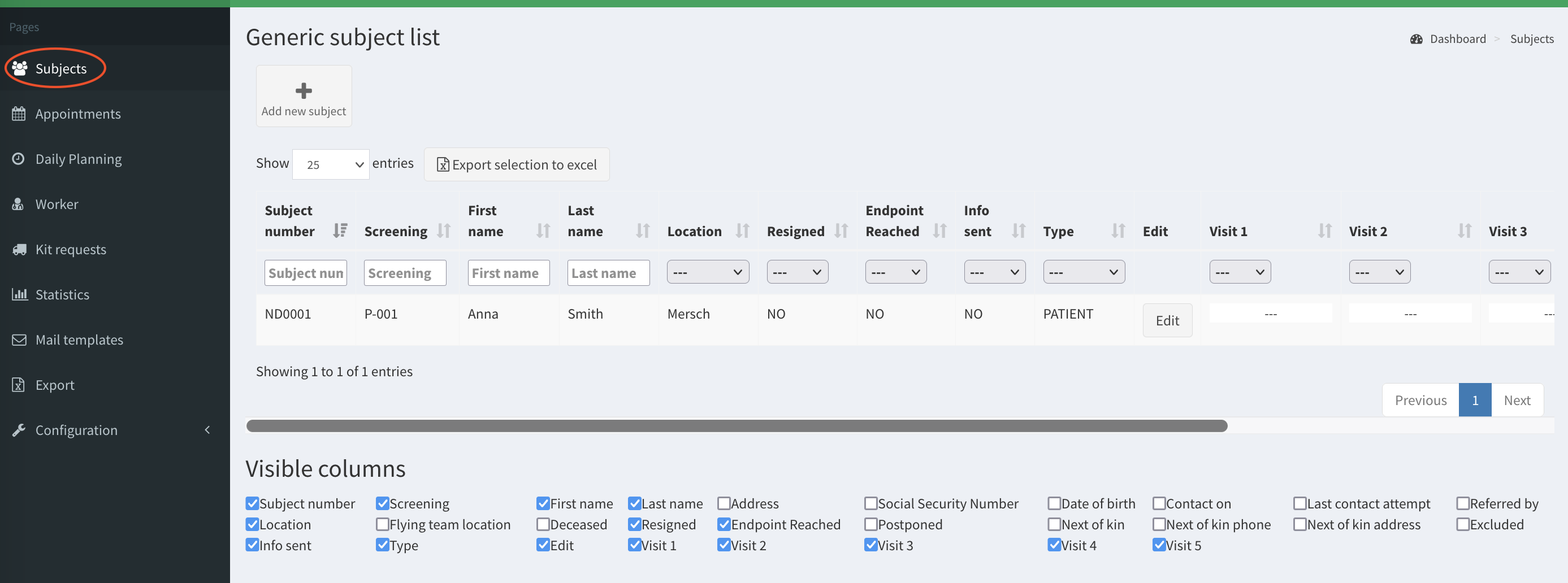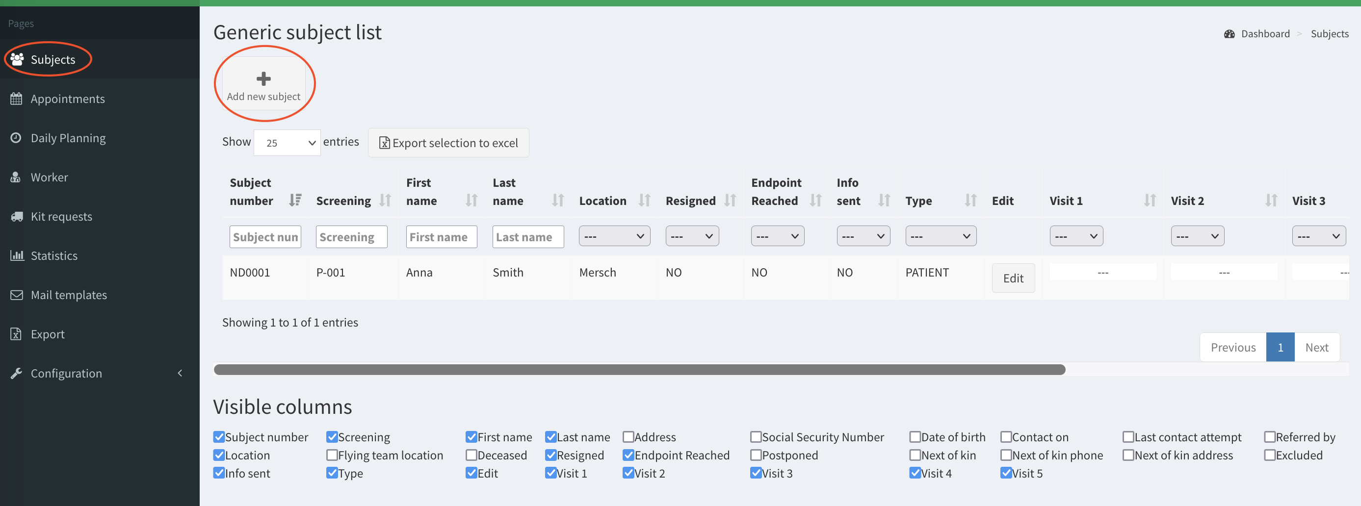 The subjects are basic entities in SMASCH. Each subject describes each patient case in the study. In the left panel you can choose Subjects to see the Generic subject list in the study. Moreover, you can check here the subject’s details, add a new subject and edit or delete existing one. Due to numerous column displayed, scroll the table right/left so see the hidden columns.