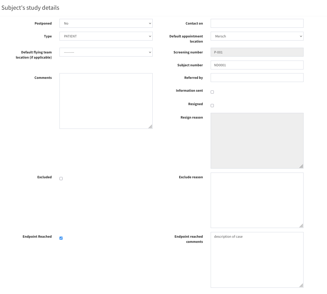 Scrolling down, there are Subject’s study details. You can change the patient’s situation in the study (Resigned, Excluded or Endpoint Reached) or add some comments there. Note: Marking a subject resigned cannot be undone.