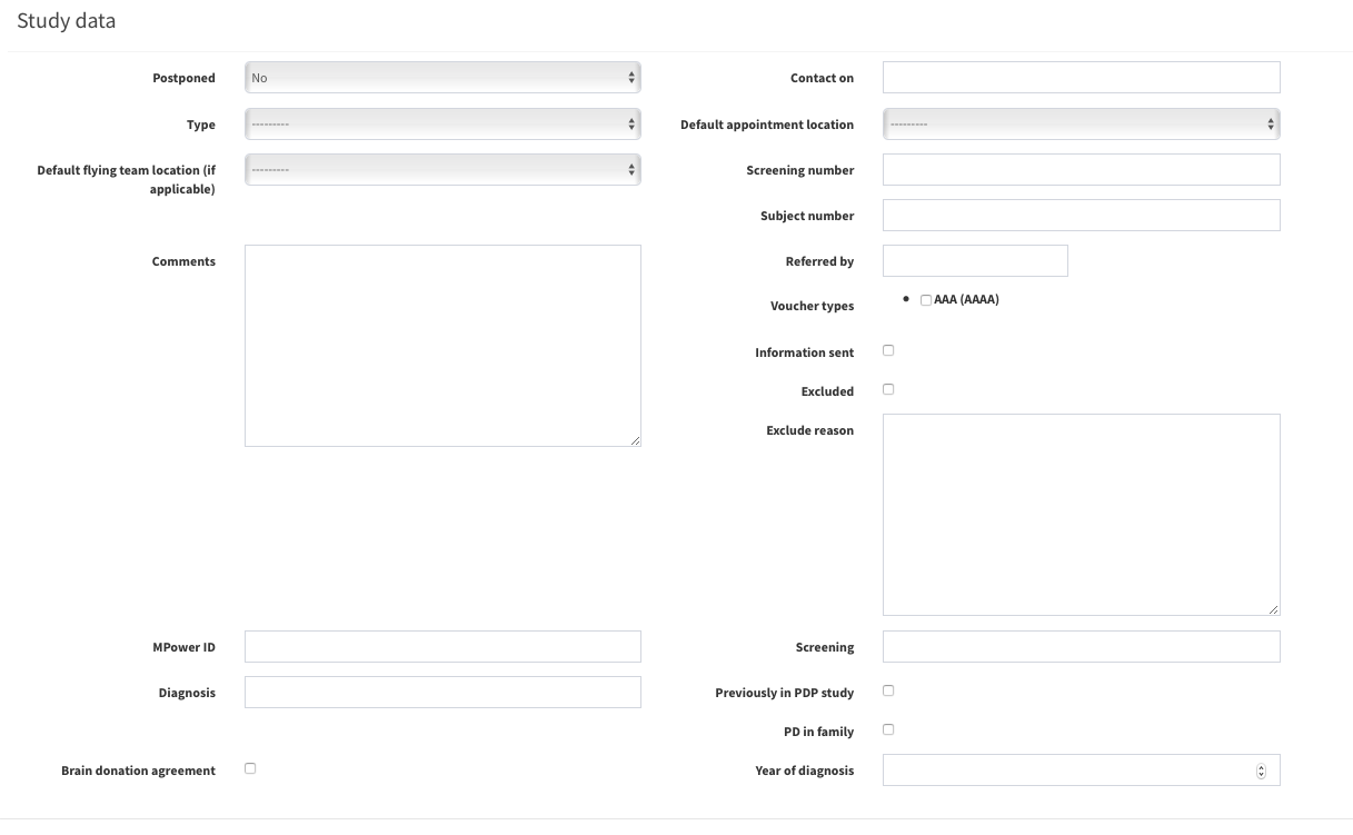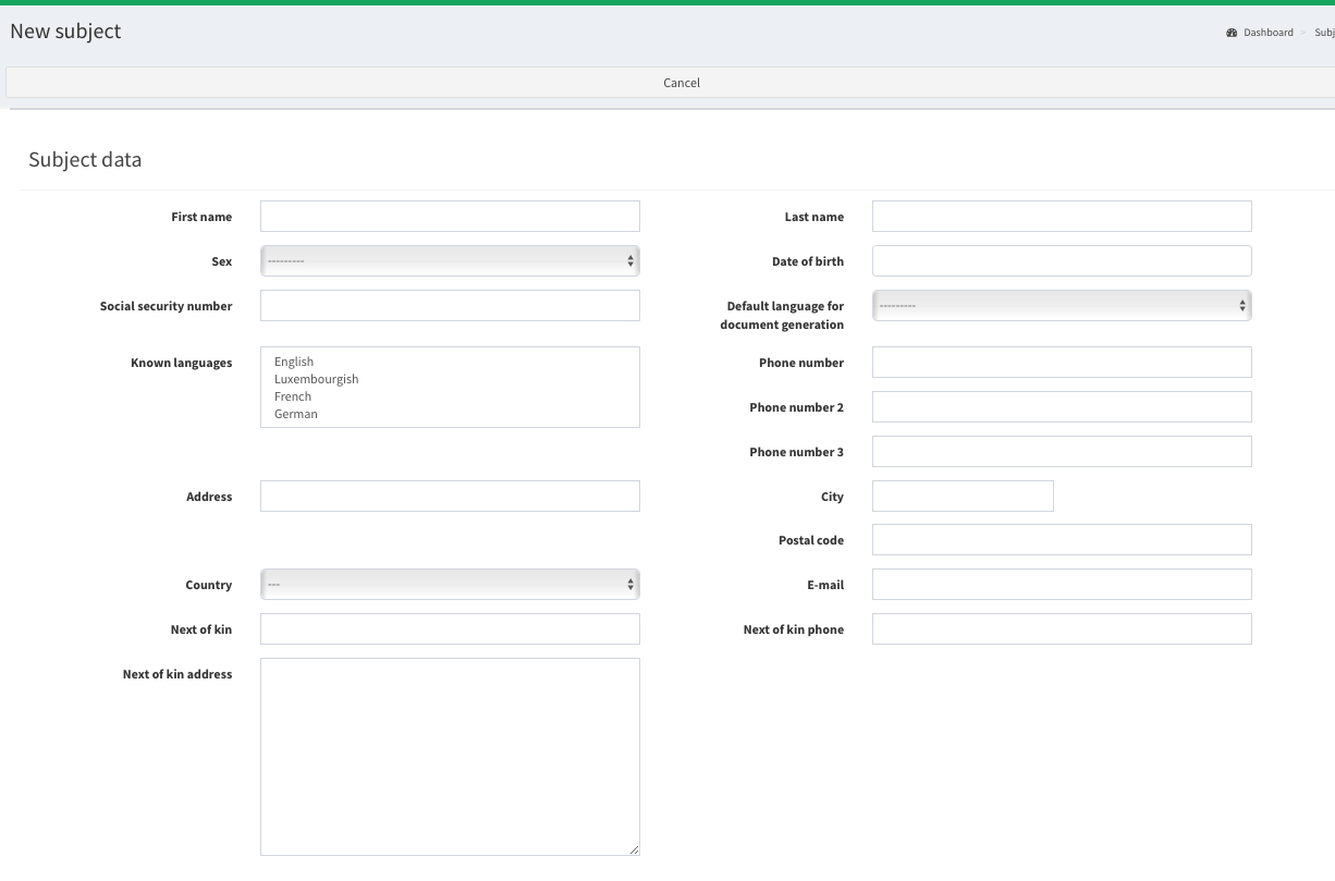 When you arrive to New subject page, you need to complete the information fields to configure the new subject. The subject data is split into personal (Subject data) and study specific (Study data). When you will be filling the form, note that: