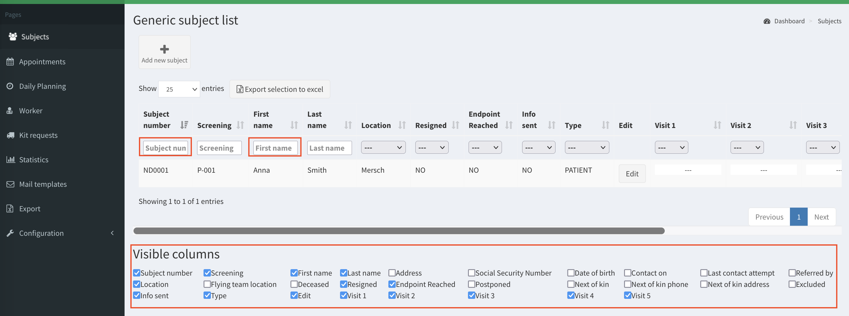 The subjects details are displayed in the configurable list. Below the subject list, there is the section Visible columns, which manages the visibility of columns in the list. The checkboxes are corresponding with the headers of the columns and tick/untick the checkbox hides/reveals the column. The default visibility of the columns in the subject list is set up in SMASCH study configuration. In the list there are few searchable columns (e.g. Subject number or First name). You may input the particular term (e.g. subject first name) in the search filed just below the column header.