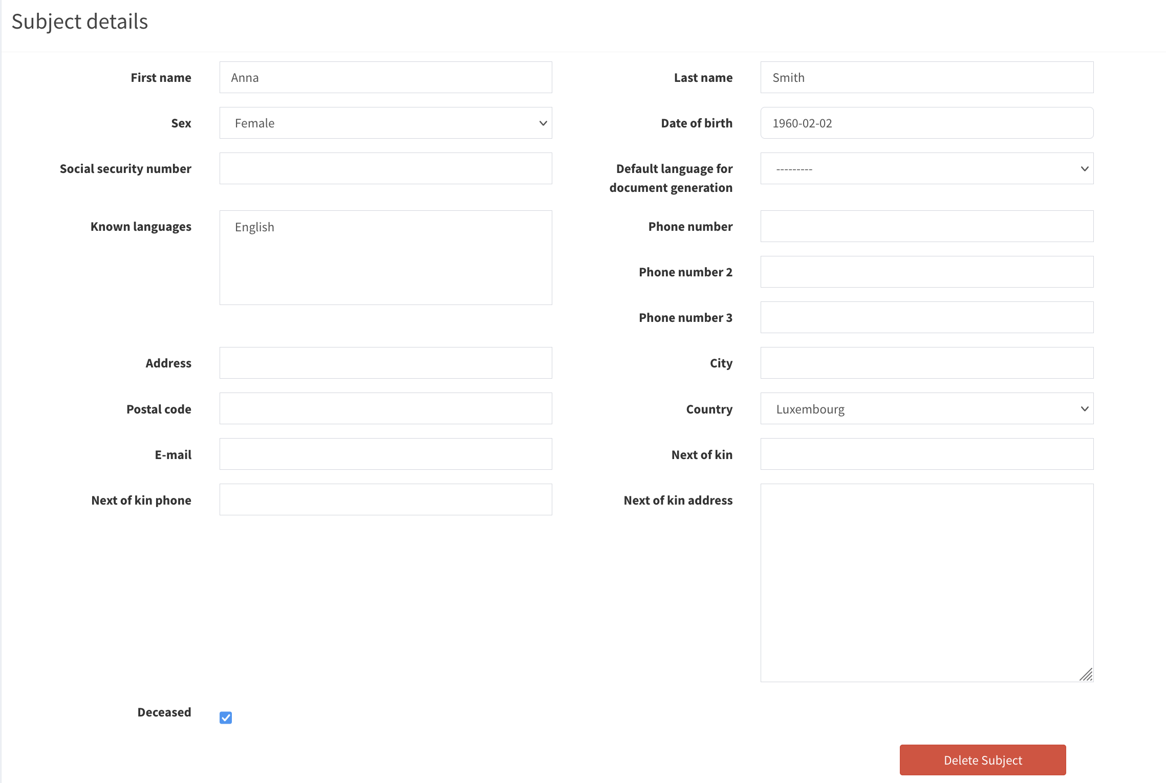 Now you see the all information about the subject. You can modify the subject data here (e.g. change the address or mark the subject as deceased) or delete the subject from the study. Note: Marking a subject deceased cannot be undone.