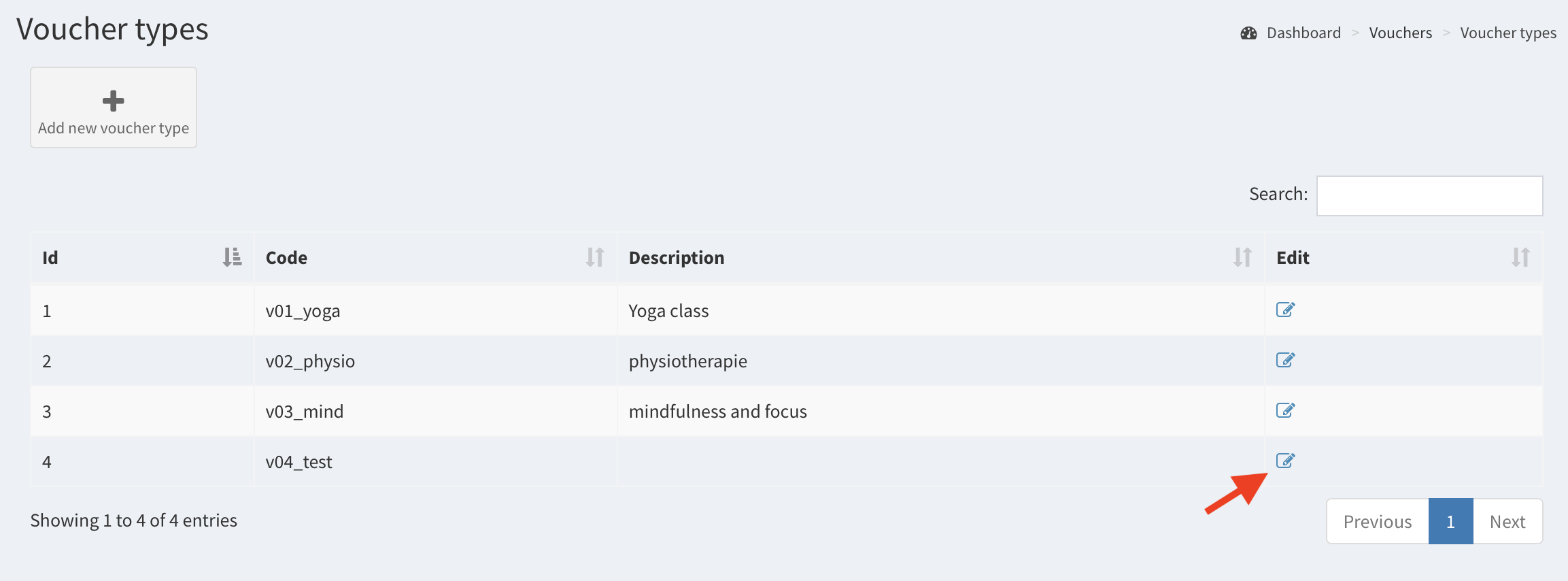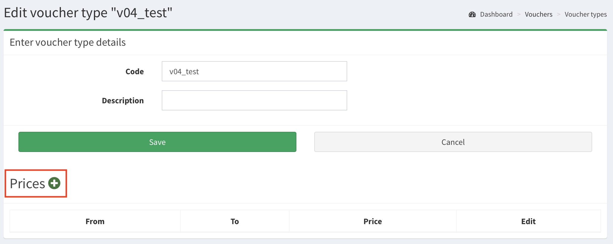 - To edit the voucher type’s details click Edit icon. Here you can change Code and Description. Note: Section Prices is deprecated feature and will be removed in upcoming SMASCH release.