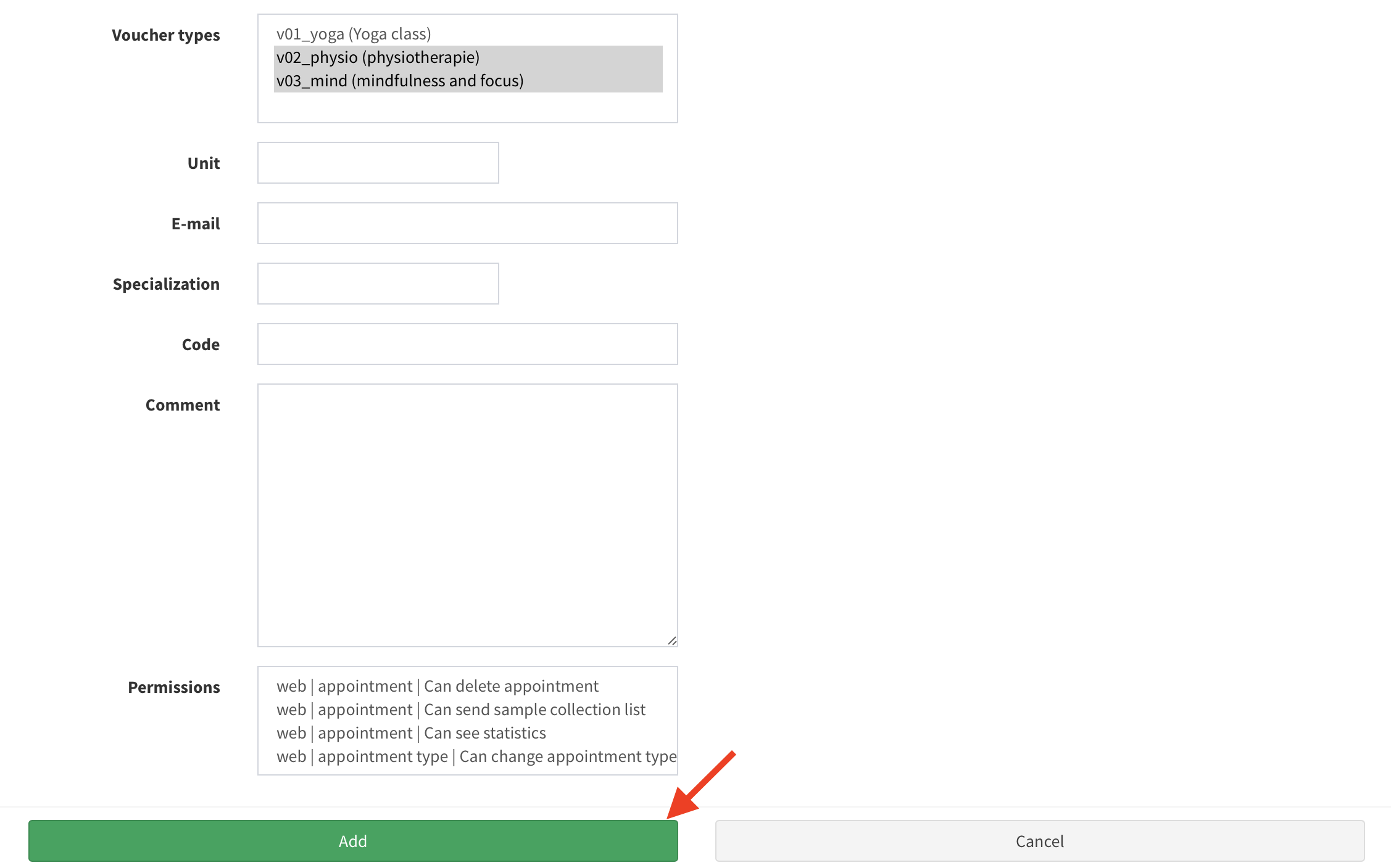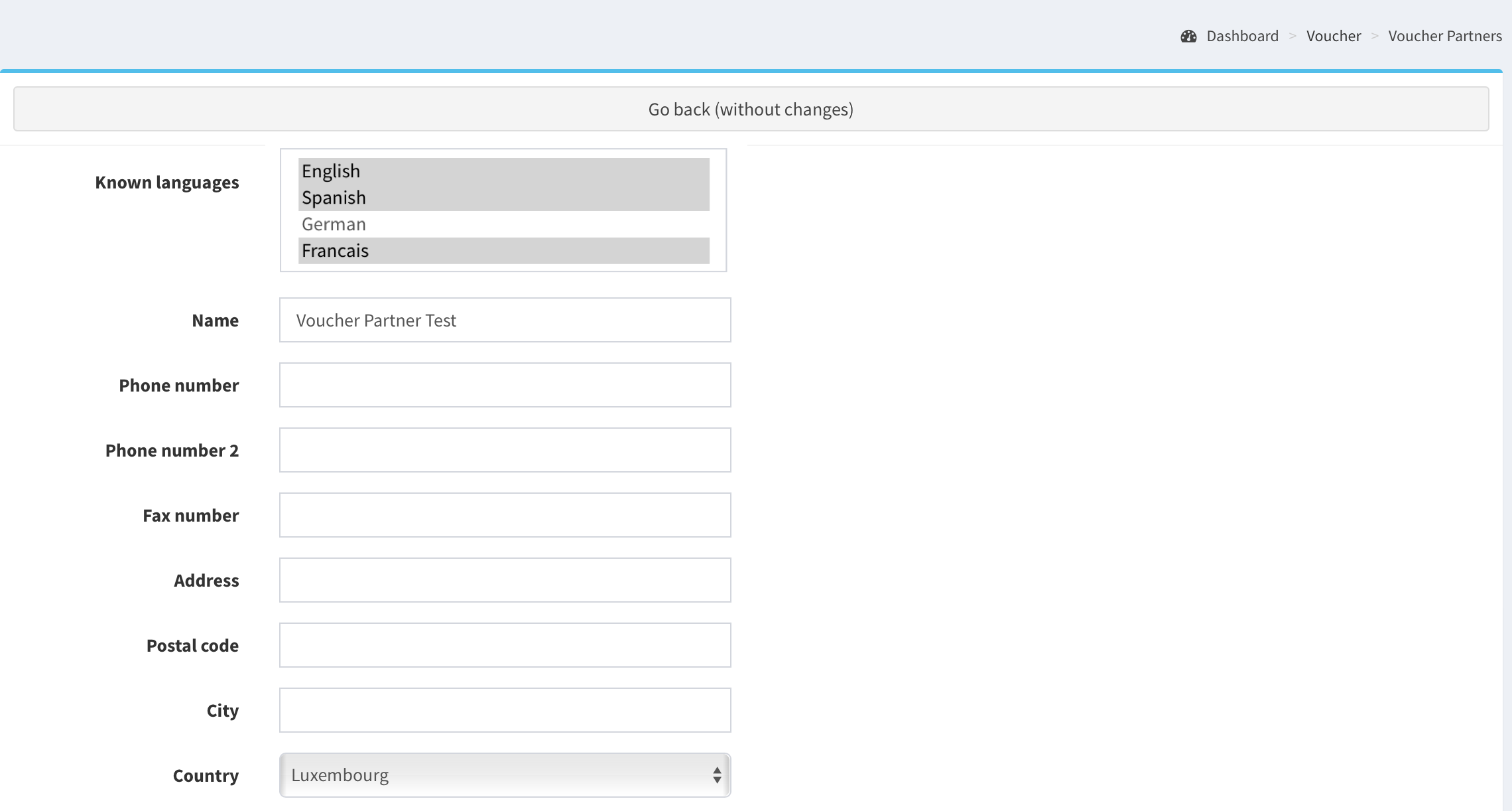 - Fill in the form with the details and click Add button to save the partner. It is important to choose what types of vouchers the partner is supporting. Note: For multiple selection press key CTRL and click on item (read more here).