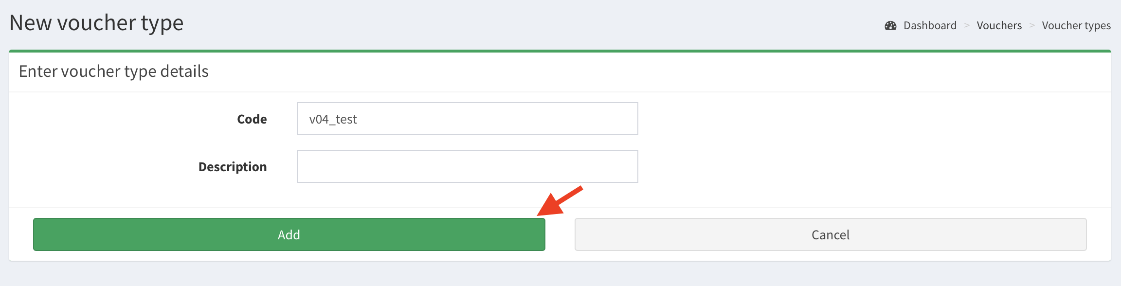 - Fill in the form. The field Code is a voucher type identifier. Then click Add button.