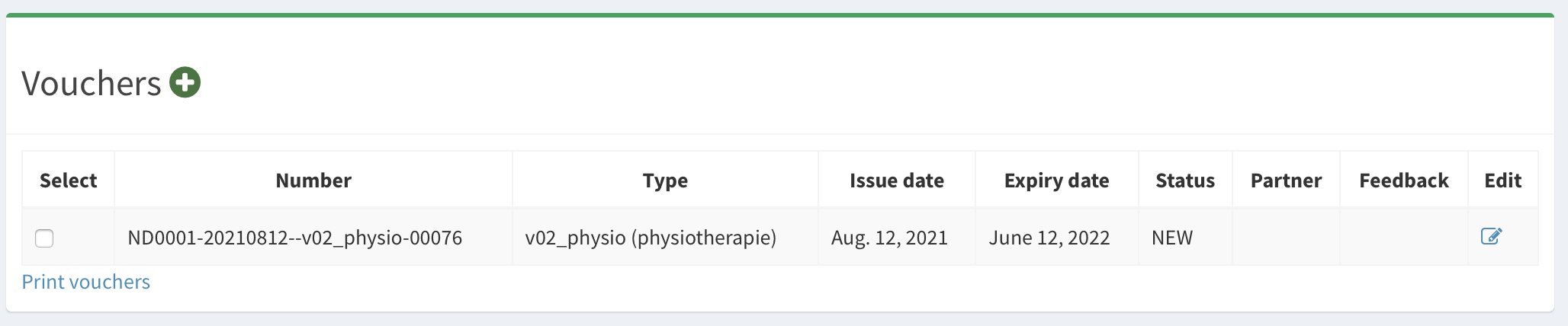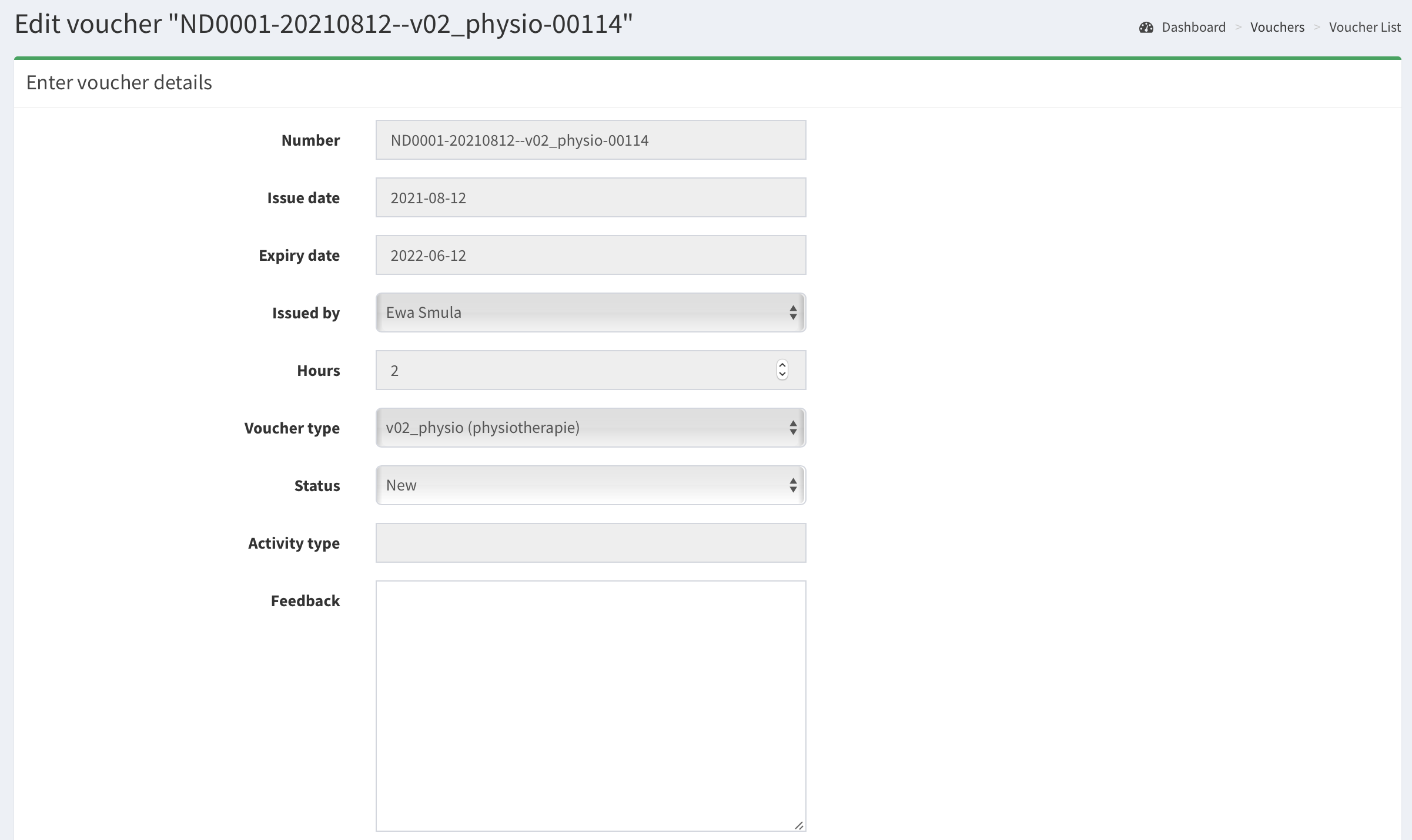 - Hours - the overall duration (in hours) of visits/sessions, that the patient is entitled with the voucher.