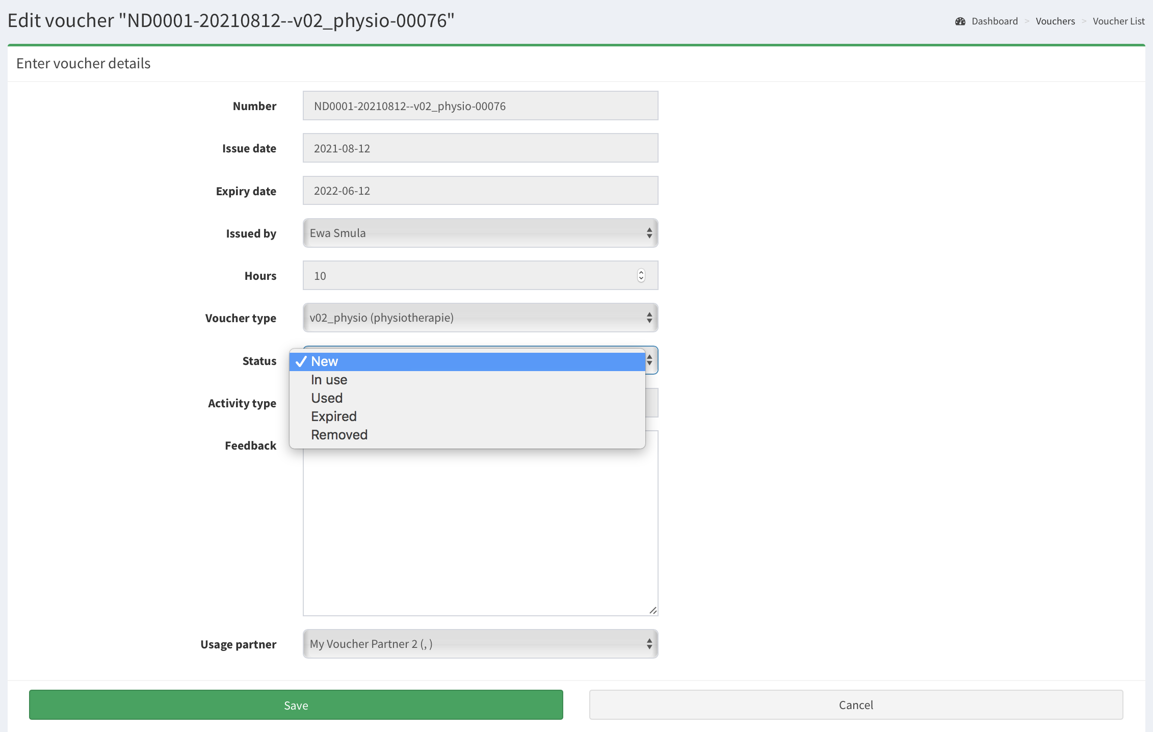 - Status - choose from the list the status of the voucher: (New, In use, Used, Expired, Removed).