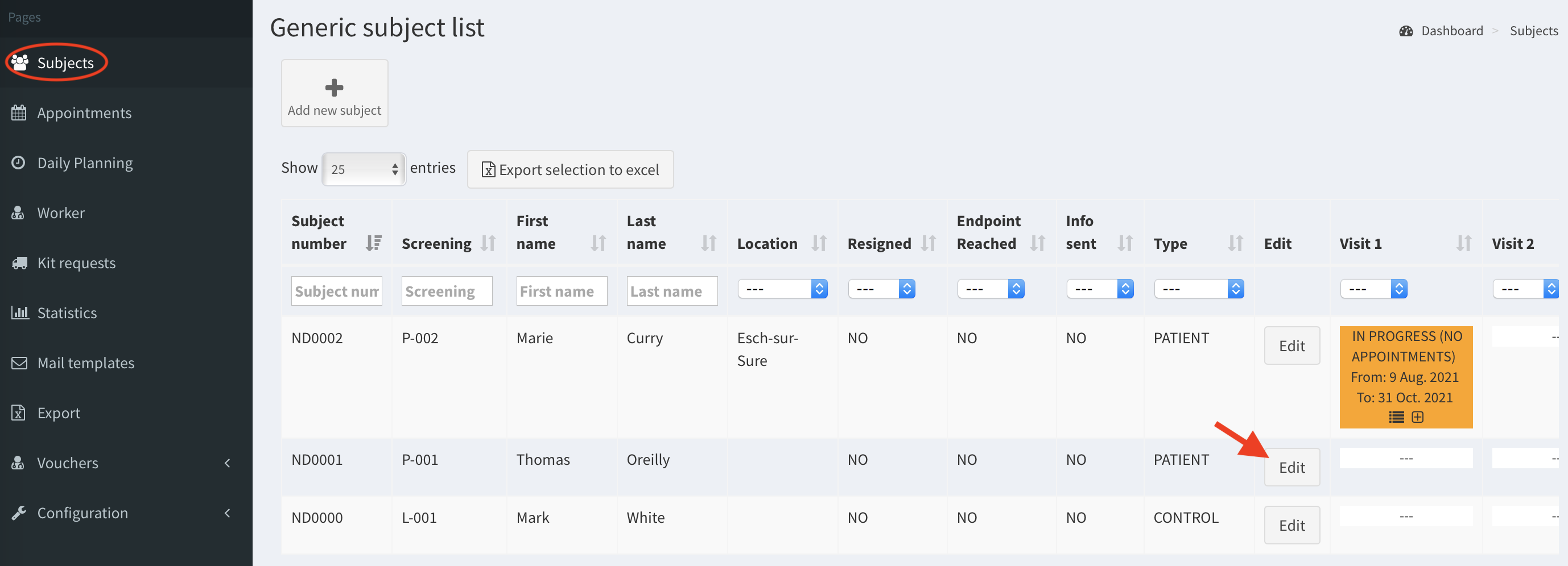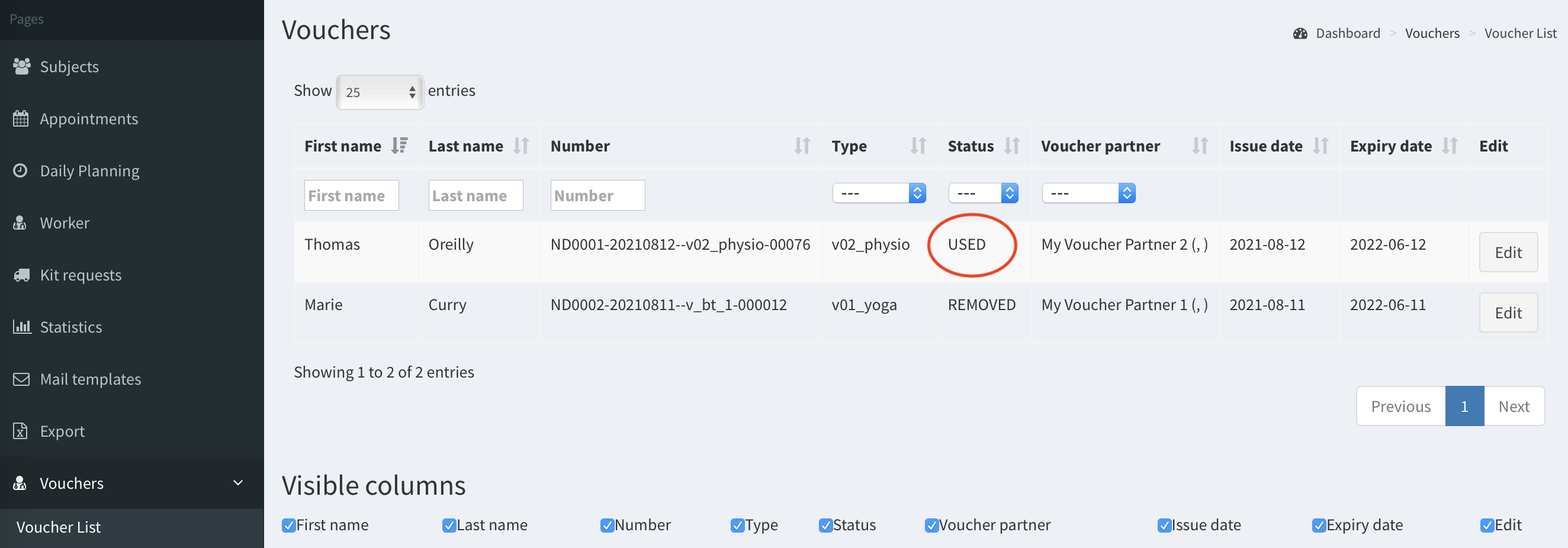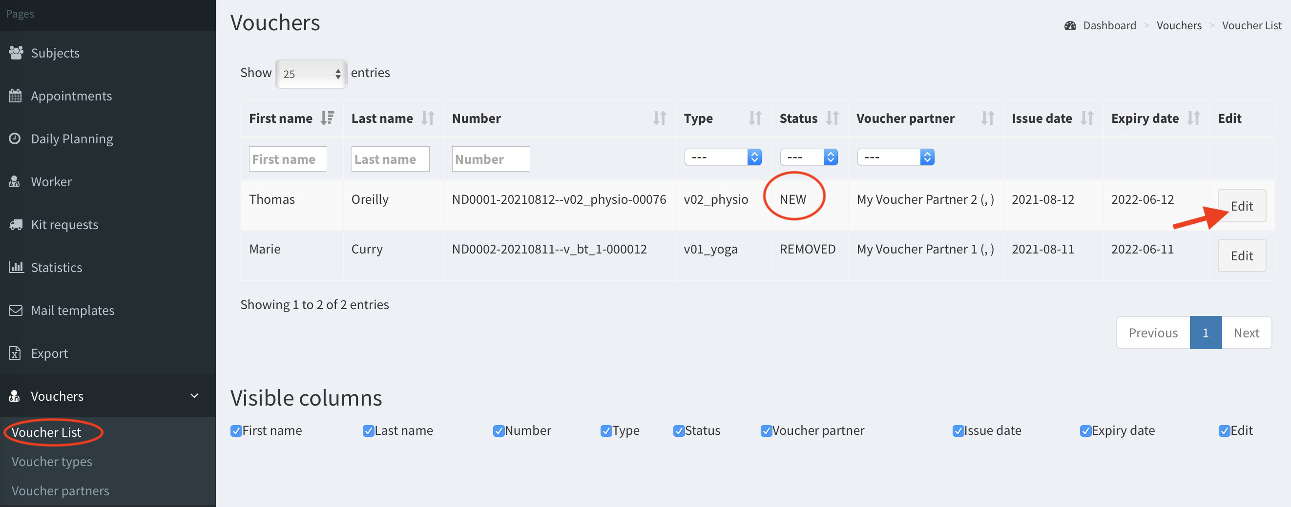 - To edit voucher status, go to Subjects >> Edit subject page or Vouchers list. Click Edit.