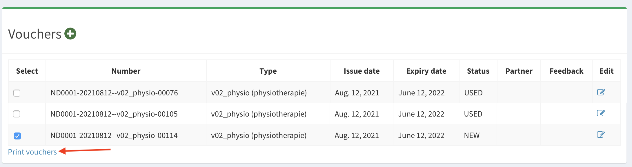 - Scroll down to Vouchers section and select the voucher you wish to print. Then click Print vouchers button. Note: There has to exist voucher mail template in order to print a voucher.