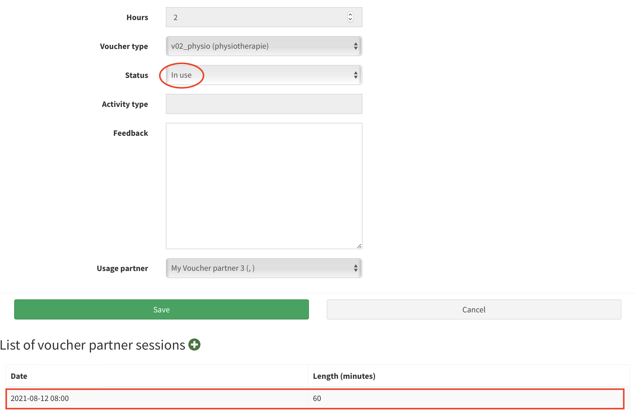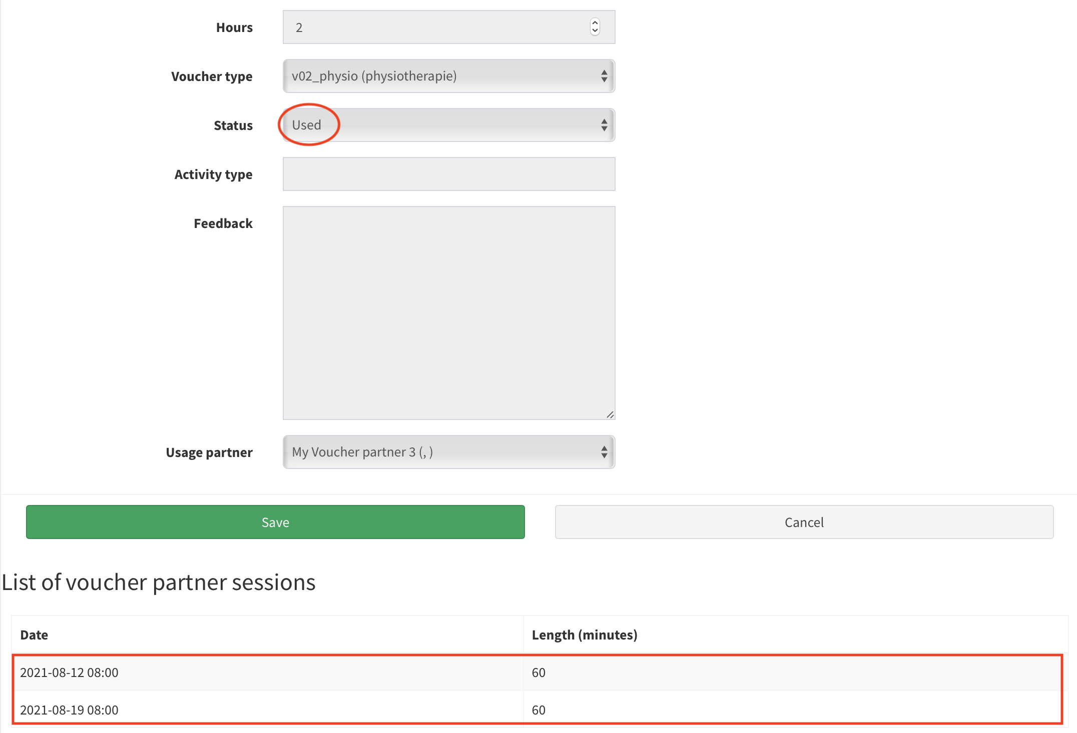 - If you repeat adding the next sessions to the list, filling step by step the voucher duration, the voucher will change the status on Used.
