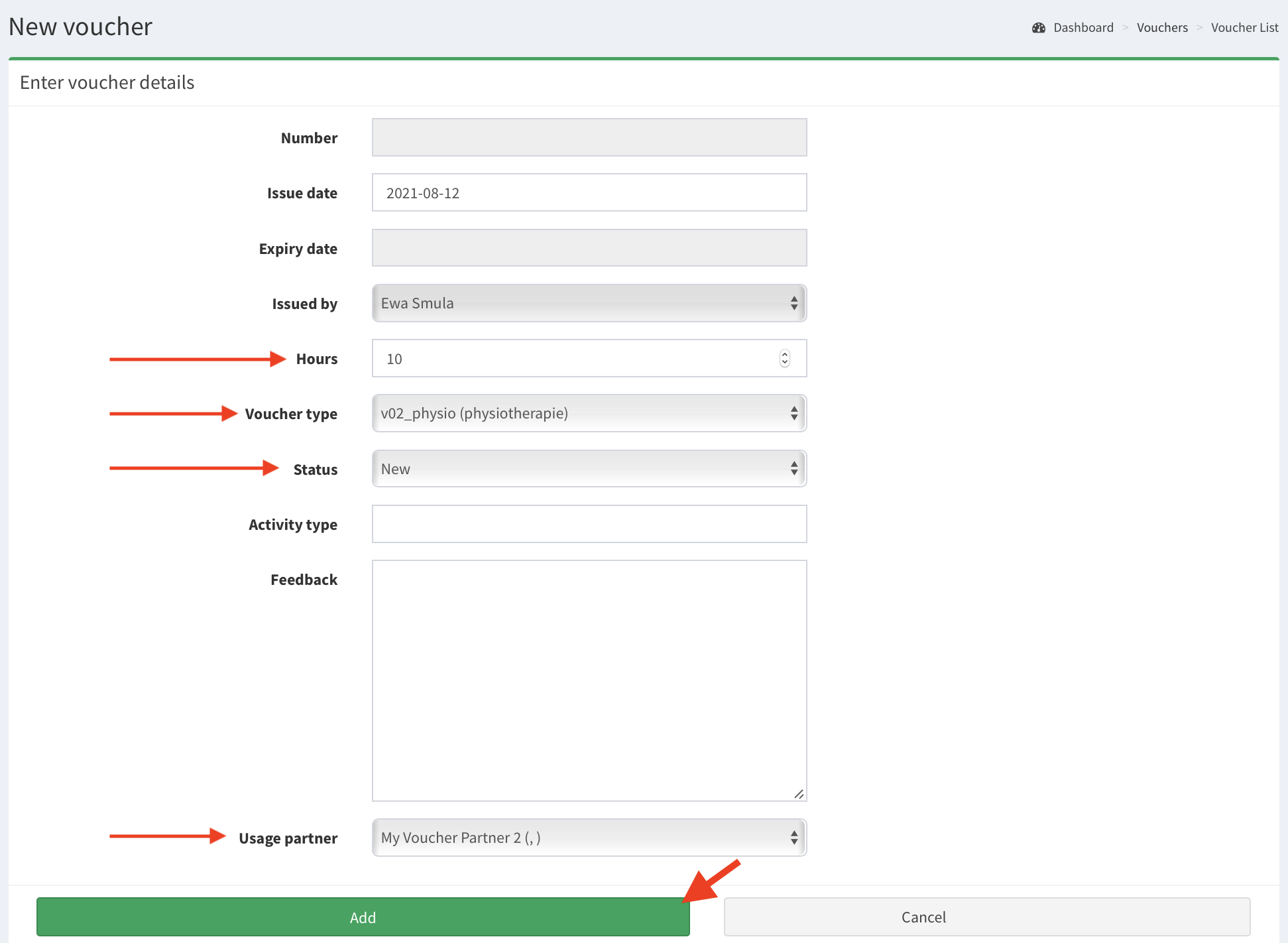 - Usage partner - the voucher partner. This field is mandatory field and cannot be changed later on by user.