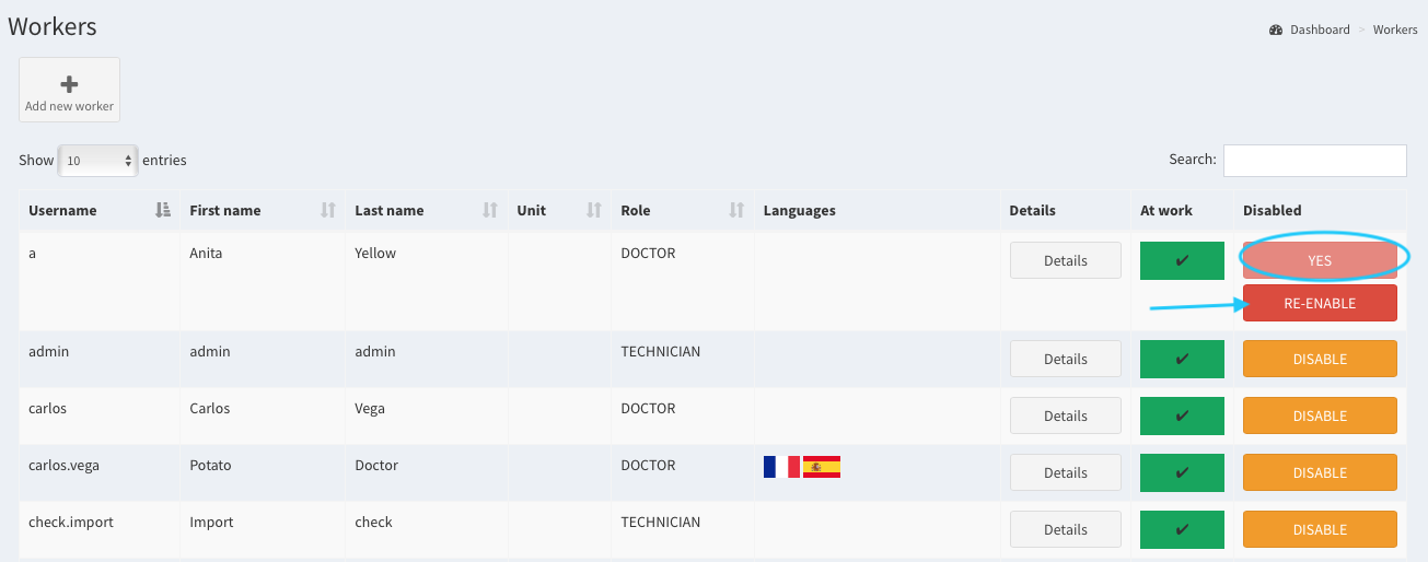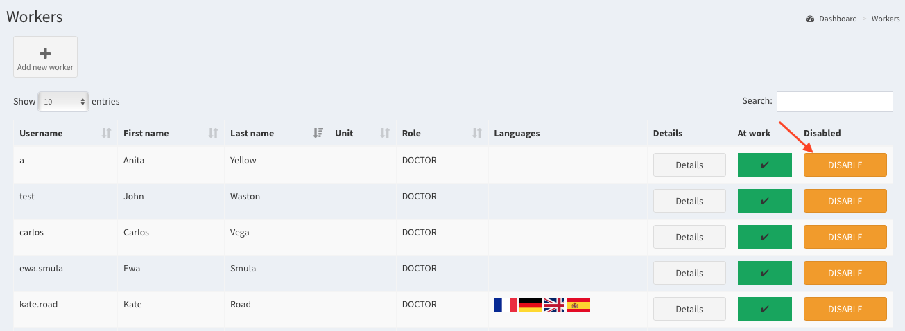 Disabled worker cannot login to the system anymore. To set worker as disabled click on the orange button Disable in the last column in Workers section (see image below).