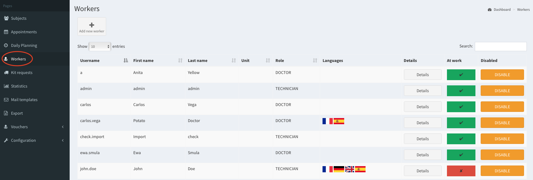 The personnel is listed in the section Workers. In SMASCH the personnel includes following roles: Doctor, Nurse, Project Manager, Psychologist, Technician and Secretary. The workers details are listed in the table, see image below. Here, you can quickly verify if the worker is currently available or on a leave (green/red mark in column At work). Also, the last column Disabled informs if the account has been disabled.