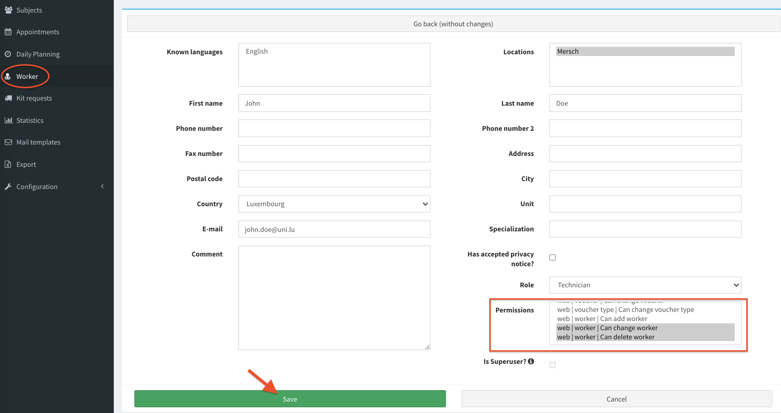 Each worker might have different scope of privileges, e.g. can manage the subjects, the appointments, the workers. The access to particular permissions is granted during adding. Also, the user’s access can be changed later, during editing the worker details. The list of all available privileges is contained in Permissions section (see image below).